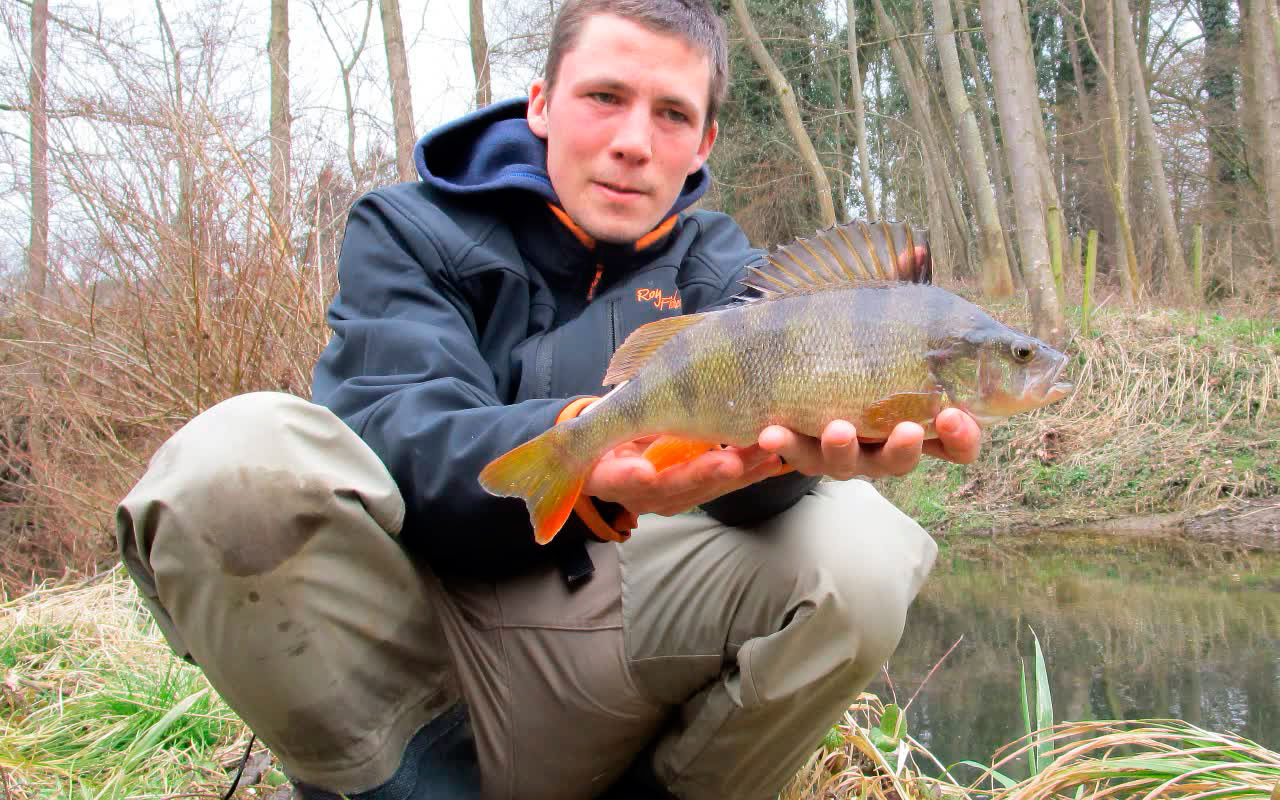 Es werden zwar in der Schweiz auch grössere Egli gefangen, aber für den kleinen Bach Aach bei Amriswil ist der 34er von Sandro Minoletti aus Amriswil ein erstaunlicher Fang. Am 12. März fischte er in diesem Bach auf Forellen. Nach einigen Verlusten platzierte er seinen Wobbler in einem vielversprechenden kleinen Gumpen in der Kehrströmung. Als er den Wobbler langsam einholte, sah er mit der Polbrille, wie ein dicker Fisch dem Wobbler folgte und kurz vor seinem Standort heftig auf ihn einknallte. Was Sandro dann beim Landen sah, konnte er kaum glauben: ein dickes 34er-Egli, ein absoluter Ausnahmefang an diesem Gewässer. Verwendetes Gerät: Shimano Stradic-Rute 1,8 m, Shimano Exage 2500 FD-Rolle, 0,10er-Berkley Fireline, Berkley Trilene Fluorocarbon-Vorfach, Rapala ULM06 AYU-Wobbler.