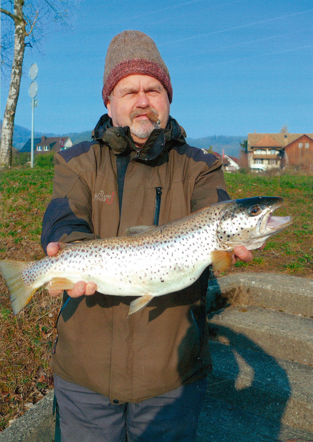 Aare-Forelle, 59 cm, 5,7 PfundAm 11. März fischte Ernst Rizzotto aus Villnachern in der Fischenz Nr. 17 (Revier KW Rupperswil bis KW Villnachern). In der ersten Stunde ging nichts, bis er gegen 8.20 Uhr beim Einholen einen harten Biss verspürte. Dann ging der Kampf los, bis er die Forelle nach einigen Minuten sicher landen konnte. Etwas später fing er noch einen 48er und eine 34er-Forelle. Verwendetes Gerät: Cusiana Bomber-Teleskoprute 4,2 m, Fario-Laufrolle, 0,18er-Fighter Monofil, Suma Vorfach, Sbirolino, Bienenmade.