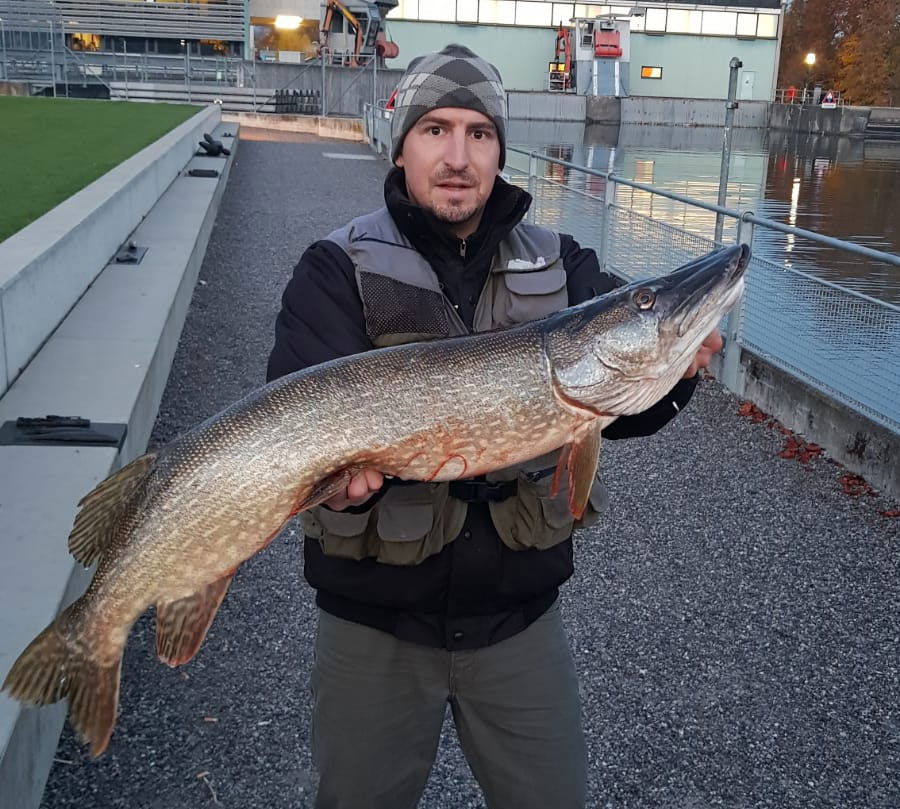 Marc Rieder aus Heiligenschwendi schreibt: «Am 7. November ging ich vor der Arbeit mit meinem Arbeitskollegen Tobi noch schnell an die Aare bei Thun, um ein paar Würfe zu machen. Um 6.50 Uhr, als langsam die Sonne aufging, kam der ersehnte Biss! Nach einigen Fluchtversuchen konnte Tobi den schönen Esox feumern. Verwendetes Gerät: Shimano Beastmaster-Rute 2,7 m, Shimano Exage 4000 RA-Rolle, 0,23er-Geflochtene, Stahlvorfach, Savage Gear 3D Line Thru Trout-Gummifisch 20 cm.»