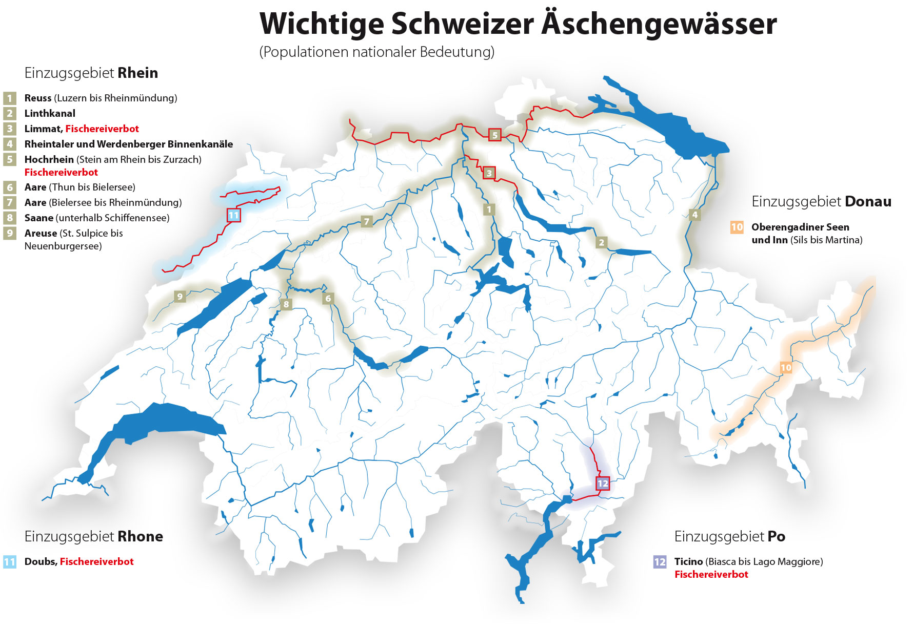 In all diesen Einzugsgebieten haben sich einzigartige Äschenpopulationen entwickelt. Die Schweiz trägt entsprechend eine grosse Verantwortung für die Biodiversität der Äsche in Mitteleuropa.