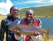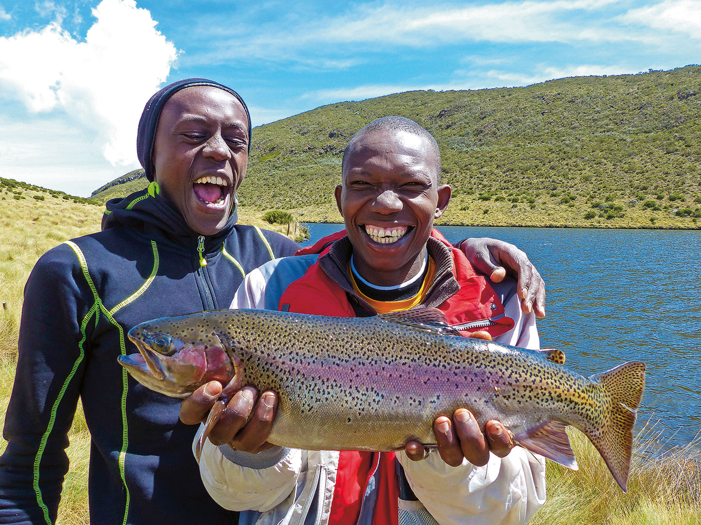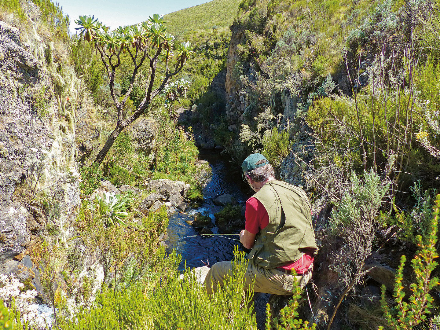 Die erste kalte Nacht verbrachte die Reisegruppe campierend beim Eingang zum Nationalpark. Die einmalige Aussicht vom Camp reichte am Morgen dank des klaren Wetters bis in die das Gebirge umgebende fruchtbare Ebene, die Trockensavanne und die Wüste. Vom Parkeingang wanderte Hansheiri mit seinen Begleitern dem auf 3600 Meter über Meer gelegenen Lake Ellis entgegen. Die Fischerei erwies sich als ausgezeichnet. Hansheiri konnte dem Bergsee mit dem 2er-Mepps gleich mehrere grosse Regenbogenforellen entlocken. Eine davon behändigte er und bereicherte damit die einfach gehaltene Verpflegung, die im Wesentlichen aus Mais- und Reisgerichten bestand. Vom Fischen selbst hatten Hansheiris afrikanische Kameraden nur wenig Ahnung. Sie zeigten sich aber sehr interessiert und begeistert von der vergnüglichen Nahrungsbeschaffung. Was ihnen mit der Fischerrute in der Hand an Knowhow fehlte, machten sie bei der Zubereitung des Fangs wett.