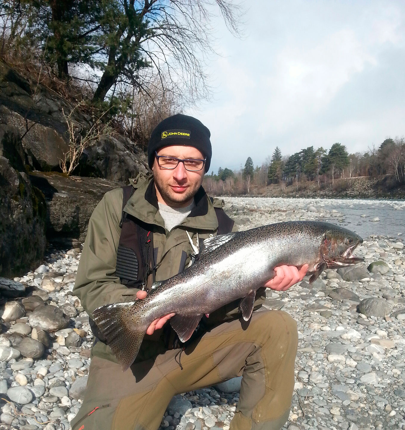 Zlatko Kolar aus Chur meldet: «Am Morgen des 22. Februar ging ich mit einem guten Gefühl an den Rhein. Nach dem dritten Wurf tauchte der Zapfen, die Schnur spannte sich und ein Zweikampf begann. Der Fisch schwamm in die Strömung. Einen Moment lang dachte ich, dass die Schnur der Spannung nicht standhalten würde und der Fisch verloren sei. Zum Glück irrte ich mich und nach längerem Drill konnte ich diese wunderschöne Regenbognerin landen. Verwendetes Gerät: Shimano BeastMaster-Rute 3,6 m, Shimano 2500-Rolle, 0,20er-Geflochtene, 0,20er-Vorfach, Bienenmade.»