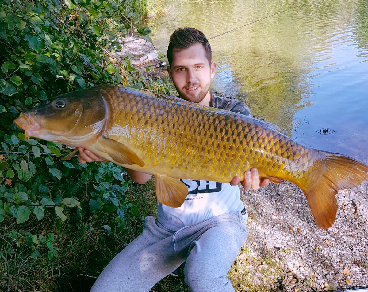 Angelo Bogetić aus Bregenz meldet: «Am Morgen des 28. August war ich mit meinem Kollegen am Fischen. Als ich meinen Köder gegen zehn Uhr einziehen wollte, kam der entscheidende Biss und ein längerer Drill folgte. Obwohl das Wasser sehr verkrautet war, schaffte ich es, den kapitalen Burschen zu landen. Nach dem kurzen Fototermin setzten wir das schonenswerte Elterntier in sein Element zurück und genossen die Morgensonne. Verwendetes Gerät: Spro Super Carp-Rute, DAM Z-Base Carp-Rolle, Frolic und zwei Maiskörner.»