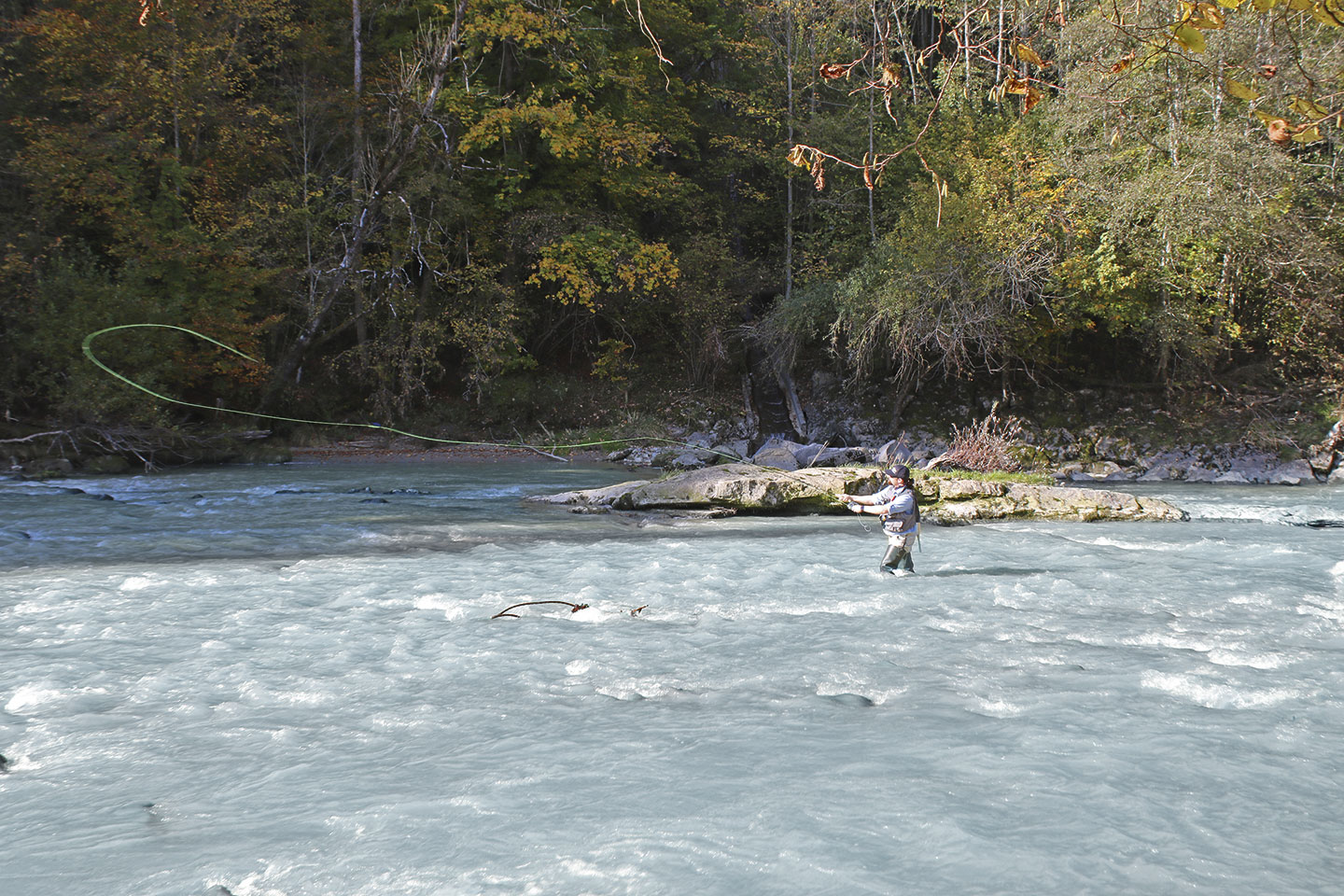 Begonnen habe ich mein Testfischen mit der 6er. Hätt ichs nicht gewusst, mir wärs gar nicht aufgefallen, dass die Rute 15 Zentimeter, oder eben einen halben Fuss, kürzer ist. Mit der 6er-Schnur ist das Werfen definitiv einfacher, hat man doch mehr Gewicht in der Luft. Auch verzeiht der elastische Blank manch einen (Anfänger-)Fehler: Die Schnur bleibt in der Luft, auch wenn man die Rute nicht ganz genau abbremst. Ich hatte beim Testen zudem nie das Gefühl, dass ich den Blank überfordern würde, auch nicht mit (wirklich) kräftigem Doppelzug. Besonders positiv empfand ich den längeren, ergonomisch sehr angenehm geformten Korkgriff, der es einem ermöglicht, auch mit ausgestrecktem Zeigefinger auf dem Kork zu fischen. Bei vielen anderen Ruten habe ich jeweils mit (zu) kurzen Griffen zu kämpfen.