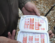 Wie so oft beim Fischen: Keine Regel ohne Ausnahme. Auf einer Kiesbank beim Katharinental sind Kurt Vosseler und Reini Weil am Fischen. Ersterer landete soeben eine knapp Mässige und schon taucht sein Zapfen wieder. Der Anschlag geht ins Leere – Fehlbiss aufs Hörnli! Nun greift auch Reini wieder zur Rute und wirft seinen Fumagalli-Zapfen mit Träschwurm ungefähr 30 Meter in den etwa 1,6 m tiefen Lauf. Währenddessen drillt Kurt bereits die nächste Äsche! Was ist denn hier los?! 30,5 cm sind ihm zu wenig und sorgfältig lässt er den Fisch wieder ins klare Wasser gleiten. Und tatsächlich verschwindet nun Reinis Zapfen. Anschlag, Drill und… er landet einen Fisch von 35 cm! Danach ist der Spuk, sprich die Beisszeit bereits wieder vorbei.