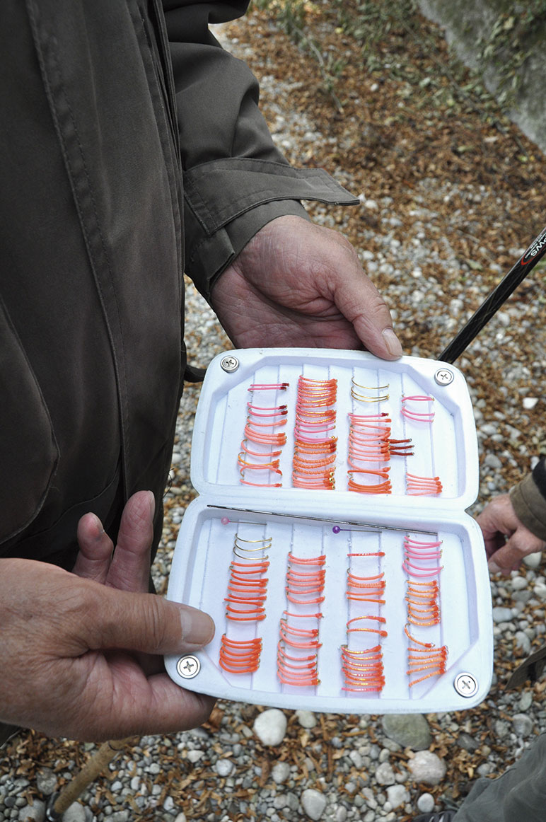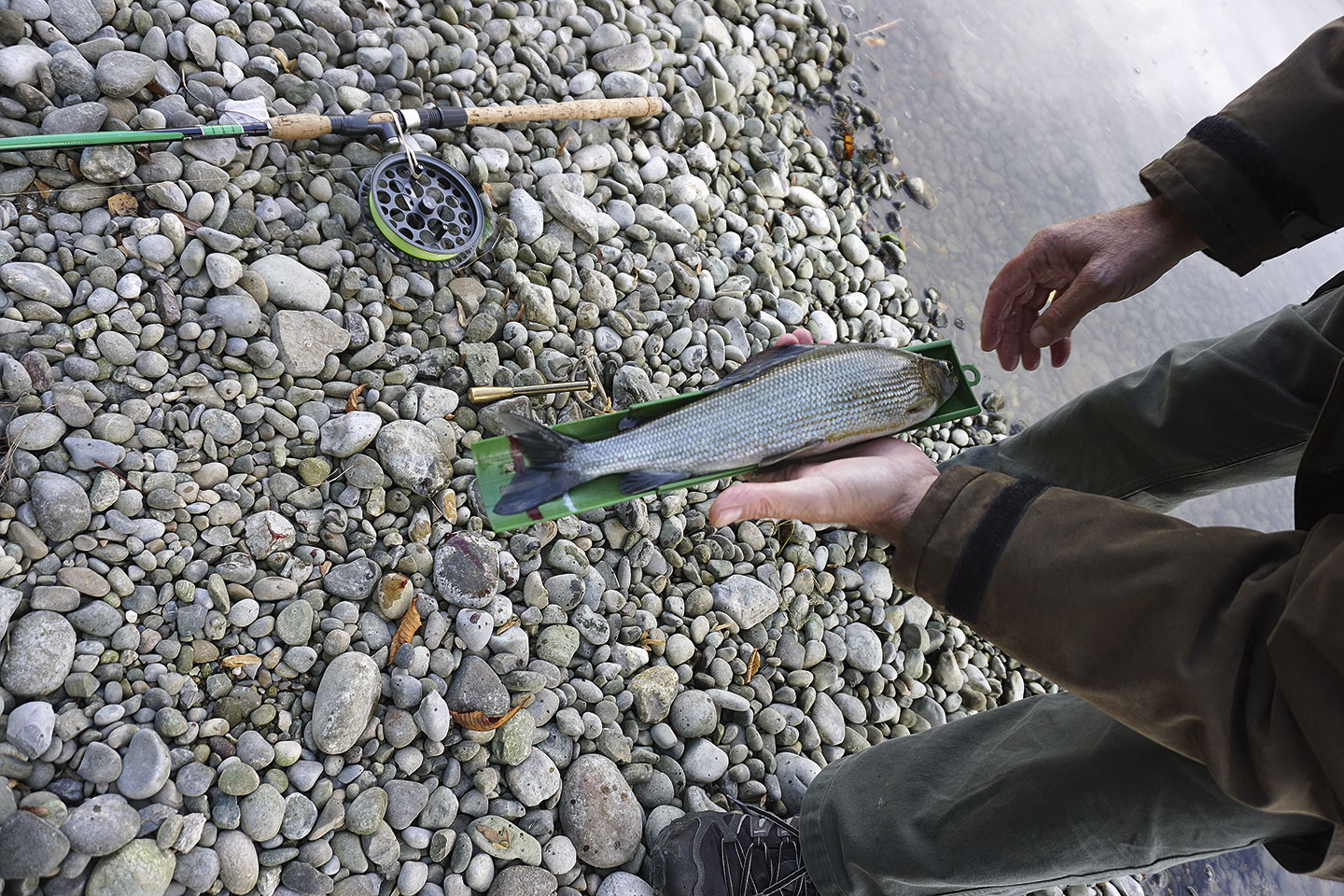 Wie so oft beim Fischen: Keine Regel ohne Ausnahme. Auf einer Kiesbank beim Katharinental sind Kurt Vosseler und Reini Weil am Fischen. Ersterer landete soeben eine knapp Mässige und schon taucht sein Zapfen wieder. Der Anschlag geht ins Leere – Fehlbiss aufs Hörnli! Nun greift auch Reini wieder zur Rute und wirft seinen Fumagalli-Zapfen mit Träschwurm ungefähr 30 Meter in den etwa 1,6 m tiefen Lauf. Währenddessen drillt Kurt bereits die nächste Äsche! Was ist denn hier los?! 30,5 cm sind ihm zu wenig und sorgfältig lässt er den Fisch wieder ins klare Wasser gleiten. Und tatsächlich verschwindet nun Reinis Zapfen. Anschlag, Drill und… er landet einen Fisch von 35 cm! Danach ist der Spuk, sprich die Beisszeit bereits wieder vorbei.
