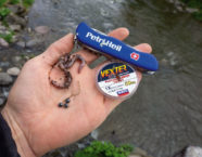 Ausgestattet mit Wanderrucksäcken und geländetauglichen Schuhen starten wir unseren Versuch an einem schönen Forellengewässer. Wir sind ungewohnt leicht unterwegs und haben weder Ruten noch eine Köderbox dabei. So ganz ohne den gewohnten Fischerkram sind wir ziemlich flott unterwegs und halten bald Ausschau nach vielversprechenden Stellen mit kleinen Läufen und Pools. Die vergangenen Maiwochen waren kühl und verregnet, entsprechend kalt und trüb kommt das Wasser daher. Wir entdecken einen Haselstrauch und entscheiden uns für zwei lange und besonders gerade wachsende Äste. An die Spitzen der zurechtgeschnittenen Stecken knüpfen wir unsere Vorfächer und wählen die Länge ungefähr so, dass wir die Haken am unteren Ende des Steckens einstecken können. Als Gewicht nehmen wir ein Klemmblei und als Bissanzeiger verwendet Ruben einen Grashalm, derweil Robin lieber einen richtigen Bachzapfen im Blick hat. Die Würmer lassen sich schnell auftreiben, indem wir einige grössere Steine umdrehen. Wir fühlen uns ins Kindesalter zurückversetzt und können es kaum erwarten, endlich unsere Würmli zu baden.