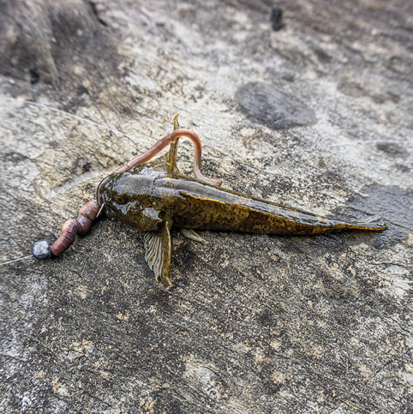 Nach etlichen erfolglosen Versuchen gewinnen wir immerhin etwas Übung und es gelingt uns zunehmend besser, uns unauffällig den interessanten Stellen zu nähern und den Wurm ohne grosses Herumfuchteln ins Wasser sinken zu lassen. Robin pirscht sich auf einen grossen Felsen und versucht von dort oben, den grossen Pool dahinter zu befischen. Da muss doch was gehen! Sein Radius reicht gerade mal aus, um den Wurm am Einlauf zu platzieren und ihn langsam in Richtung Pool treiben zu lassen. So idyllisch und fängig die Stelle auch aussieht, es tut sich fürs Erste nichts. Nach etlichen Versuchen scheint sich der Wurm auf einmal am Grund festgesetzt zu haben. Ein Hänger mit der Haselrute? Robin schwant nichts Gutes. Nach zaghaftem Ziehen zeigt sich aber, dass ein Fisch und nicht der Haken den Widerstand am Grund verursacht. An Land gehievt, entpuppt sich der vermeintliche Hänger als Groppe. Robin staunt und ist begeistert. Es ist seine allererste Groppe – und dies ausgerechnet mit einer Haselrute auf einen Wurm, der fast so gross ist wie das Tierchen selbst. Robin sieht sich die Groppe ganz von nahem an und findet, sie sehe aus wie ein veritables Urzeitmonster. Ihm fällt auf, das sein Blei heruntergerutscht ist. Er hat den Wurm im Stil eines Cheburashka-Rigs gefischt. Warum nicht mal mit solchen Rigs am Fluss fischen? Das will sich Robin merken.