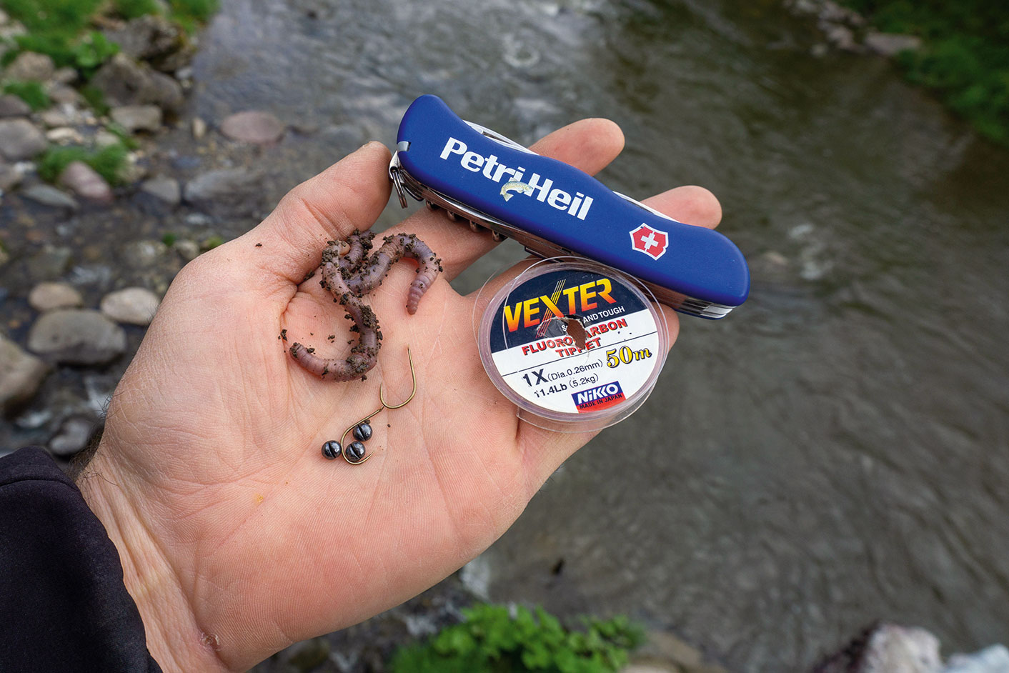 Ausgestattet mit Wanderrucksäcken und geländetauglichen Schuhen starten wir unseren Versuch an einem schönen Forellengewässer. Wir sind ungewohnt leicht unterwegs und haben weder Ruten noch eine Köderbox dabei. So ganz ohne den gewohnten Fischerkram sind wir ziemlich flott unterwegs und halten bald Ausschau nach vielversprechenden Stellen mit kleinen Läufen und Pools. Die vergangenen Maiwochen waren kühl und verregnet, entsprechend kalt und trüb kommt das Wasser daher. Wir entdecken einen Haselstrauch und entscheiden uns für zwei lange und besonders gerade wachsende Äste. An die Spitzen der zurechtgeschnittenen Stecken knüpfen wir unsere Vorfächer und wählen die Länge ungefähr so, dass wir die Haken am unteren Ende des Steckens einstecken können. Als Gewicht nehmen wir ein Klemmblei und als Bissanzeiger verwendet Ruben einen Grashalm, derweil Robin lieber einen richtigen Bachzapfen im Blick hat. Die Würmer lassen sich schnell auftreiben, indem wir einige grössere Steine umdrehen. Wir fühlen uns ins Kindesalter zurückversetzt und können es kaum erwarten, endlich unsere Würmli zu baden.