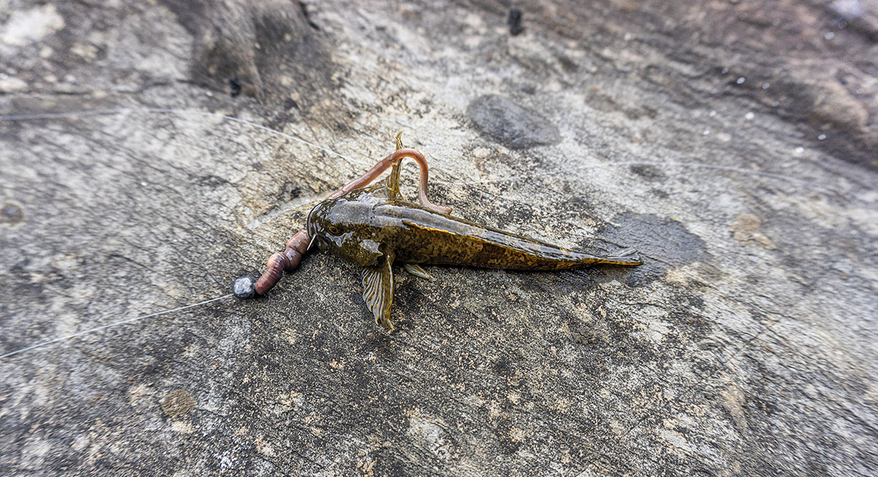 Nach etlichen erfolglosen Versuchen gewinnen wir immerhin etwas Übung und es gelingt uns zunehmend besser, uns unauffällig den interessanten Stellen zu nähern und den Wurm ohne grosses Herumfuchteln ins Wasser sinken zu lassen. Robin pirscht sich auf einen grossen Felsen und versucht von dort oben, den grossen Pool dahinter zu befischen. Da muss doch was gehen! Sein Radius reicht gerade mal aus, um den Wurm am Einlauf zu platzieren und ihn langsam in Richtung Pool treiben zu lassen. So idyllisch und fängig die Stelle auch aussieht, es tut sich fürs Erste nichts. Nach etlichen Versuchen scheint sich der Wurm auf einmal am Grund festgesetzt zu haben. Ein Hänger mit der Haselrute? Robin schwant nichts Gutes. Nach zaghaftem Ziehen zeigt sich aber, dass ein Fisch und nicht der Haken den Widerstand am Grund verursacht. An Land gehievt, entpuppt sich der vermeintliche Hänger als Groppe. Robin staunt und ist begeistert. Es ist seine allererste Groppe – und dies ausgerechnet mit einer Haselrute auf einen Wurm, der fast so gross ist wie das Tierchen selbst. Robin sieht sich die Groppe ganz von nahem an und findet, sie sehe aus wie ein veritables Urzeitmonster. Ihm fällt auf, das sein Blei heruntergerutscht ist. Er hat den Wurm im Stil eines Cheburashka-Rigs gefischt. Warum nicht mal mit solchen Rigs am Fluss fischen? Das will sich Robin merken.