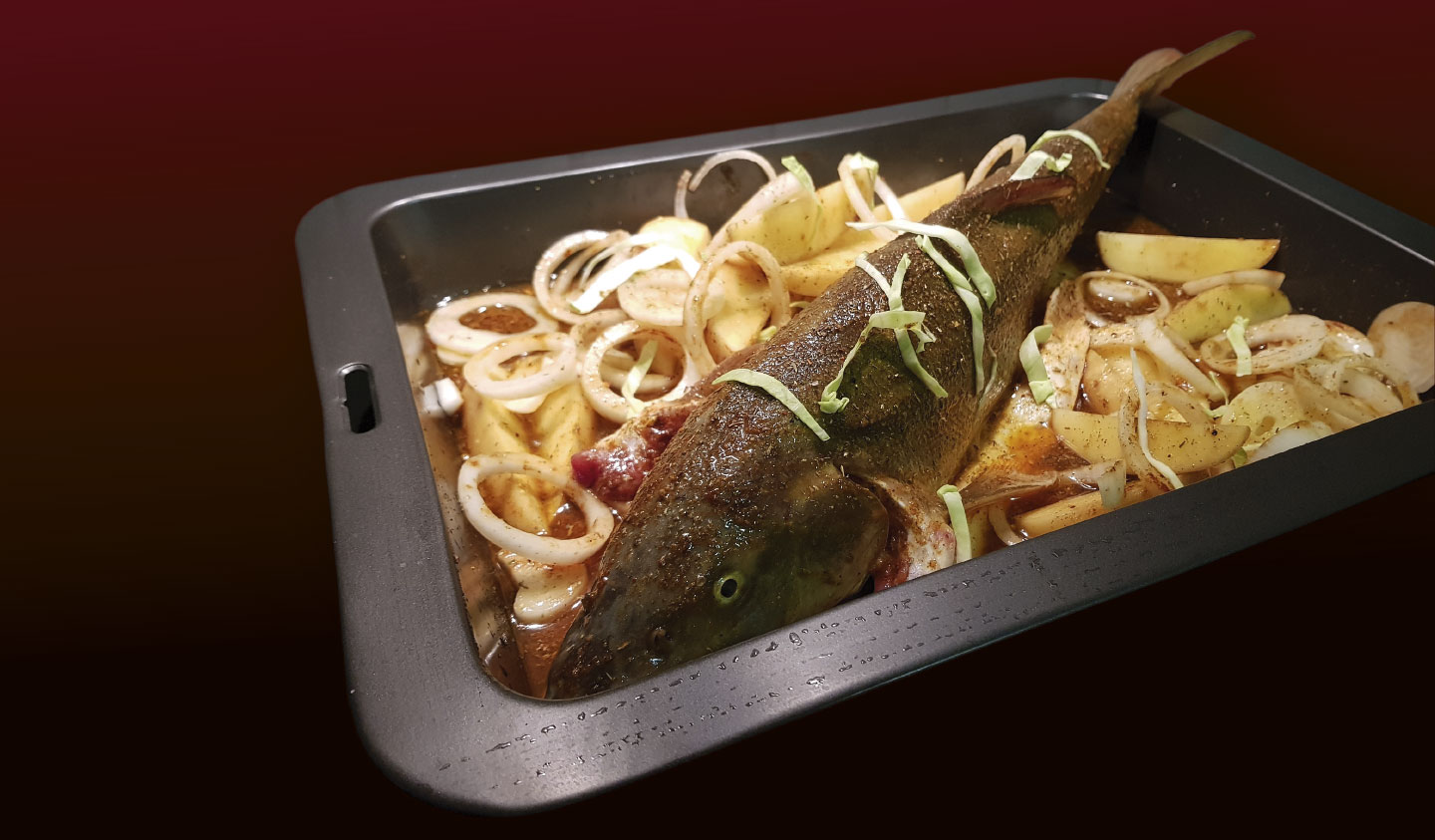 Den Fisch dann auf ein Bett aus fein geschnittenen Kartoffelwürfeln und (Frühlings-)Zwiebelringen (mit den selben Gewürzen und demselben Olivenöl verfeinert wie der Fisch) aufs Backblech legen und – je nach Grösse der Barbe – 30 bis 45 Minuten mit Umluft bei 180 °C backen.
