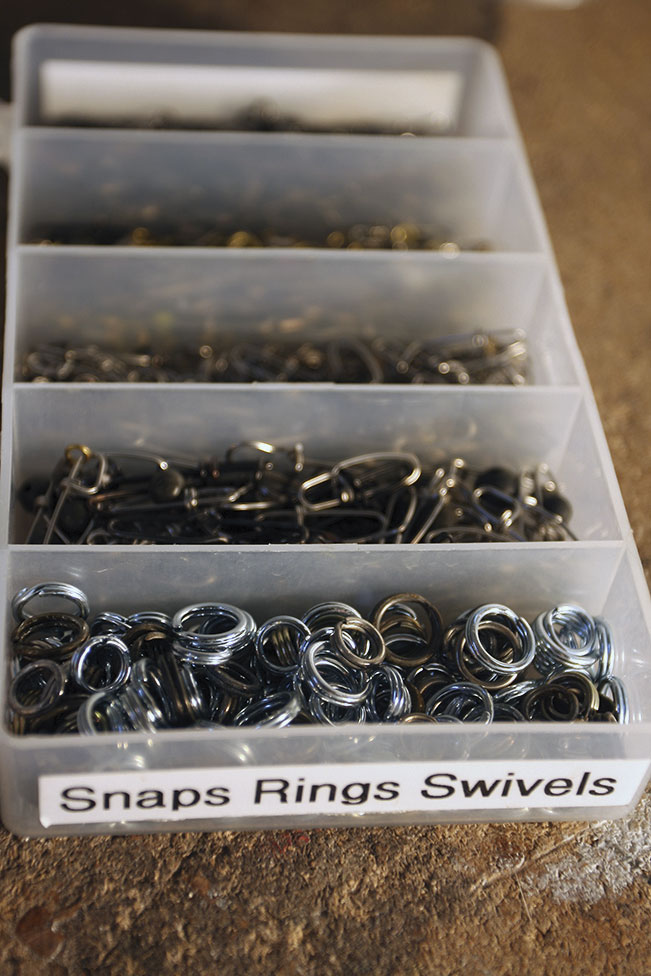 Und dann bleiben uns noch die Kleinteile. Die Versorgeboxen werden gereinigt und neu befüllt. Die in diversen Grössen vorhandenen Quetschhülsen, Wirbel, Sprengringe, Stopperperlen, Snaps, Ködernadeln usw. werden wieder säuberlich getrennt, ergänzt und alles wieder beschriftet. Zu den Wartungsarbeiten gehört für mich auch immer, eine durchdachte Ordnung einzuhalten. Durch meine vielen Fischerreisen und -trips entwickelt die Ordnung manchmal eine unüberschaubare Eigendynamik, die es in der ruhigen Jahreszeit wieder einmal zu entflechten gilt. In der neuen Saison will ich alles auch im Halbdunkeln wieder griffbereit haben.
