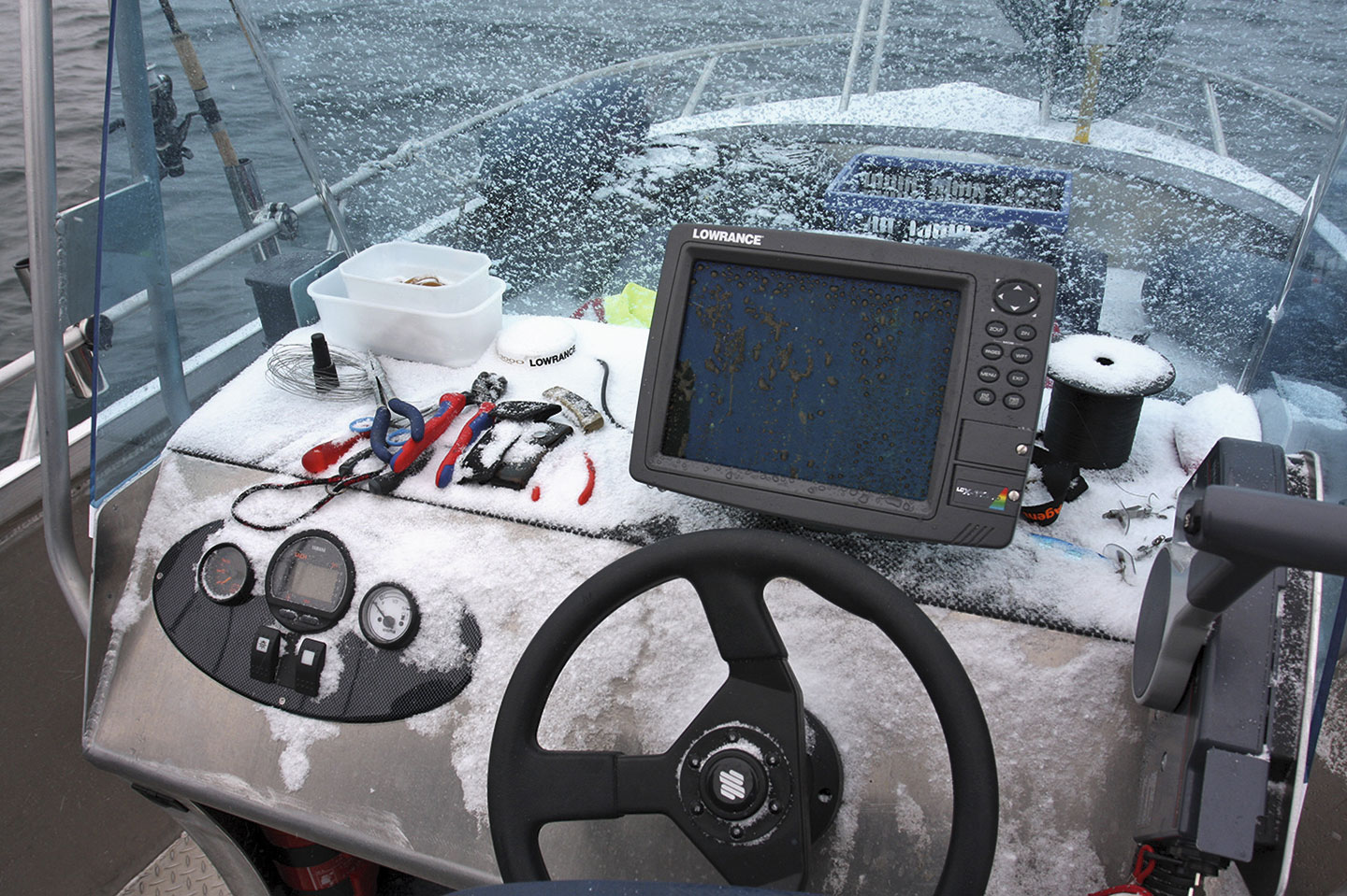 Im ersten fahlen Morgenlicht beladen wir das Schleppfischerboot. Die wieder auf Vordermann gebrachten Ruten, die neuorganisierten Geräteboxen, der grosse Feumer, Thermosflaschen, Verpflegung usw. werden verstaut. Eingemummt in dicke Winteranzüge, Fellmützen und mit schwerem Sorel-Schuhwerk gehen wir die Seeforelleneröffnung dieses Winters an.