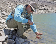 Vito fischt mit einem Streamer, dem er zwei Nymphen vorschaltet. Und hat damit auch ziemlich schnell Erfolg: Zwei Rotgetupfte kann er innert kurzer Zeit verhaften, lässt sie aber auch gleich wieder gehen – die geforderten 24 Zentimeter sind nicht erreicht. Die Trockenfliege hingegen bringt keinen Biss.