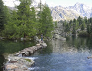 Nach einer wiederum recht anspruchsvollen Abfahrt über Stock und Stein kommen wir wenig später am Lago Bianco an, einem hellblau schimmernden Stausee. Vom Veloweg sehen wir, wie die Forellen steigen. Vollbremse, die Bikes an die Felswand gelehnt und ab in die Tiefe, über Schottersteine und raus mit der Fliege!