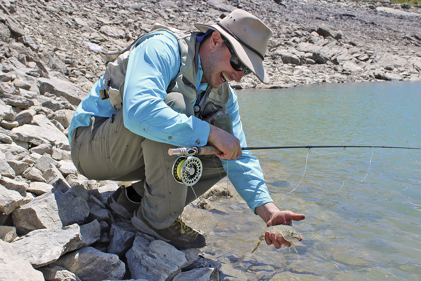 Biss! Wenig später löst Michele seinen ersten Fisch – eine kleine, aber wunderschön gezeichnete Bachforelle – vom Haken. «Zu klein», ist sein Urteil, und so lässt er sie wieder schwimmen.