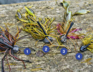 Für die langsame Köderführung sind eine Baitcaster-Rolle (kleine Multirolle) und eine Rute mit Rückgrat unverzichtbar. Dank dieser Geräte sind äusserst präzise Würfe möglich, da beim Wurf eine direktere Verbindung zur Rolle besteht. Damit kann man den Köder sogar während des Wurfs ein wenig lenken. Bei einer Stationärrolle würde der Köder hingegen eine ballistische Flugkurve, also einen Bogen beschreiben. Des Weiteren kann man mit einer Baitcaster den Köder selbst bei niedriger und gut kontrollierbarer Geschwindigkeit praktisch geräuschlos auf dem Wasser absetzen. Das ist insofern wichtig, als dass die kleinen neugierigen Egli durch lautes Platschen oftmals besonders schnell angelockt werden. Sie nehmen ihren grossen Artgenossen dann die Chance, zu beissen, weil sie sich zuerst auf den Köder stürzen. Darum ist neben der dezenten Präsentation auch ein entsprechend grosser Köder von Vorteil. Ich setze auf mindestens zehn Zentimeter lange Krebs-Nachbildungen in Verbindung mit dem Fransenjig. Dieser entfaltet unter Wasser ein besonderes Spiel und verstärkt die Abwehrhaltung, die wir mit dem Krebs imitieren wollen.