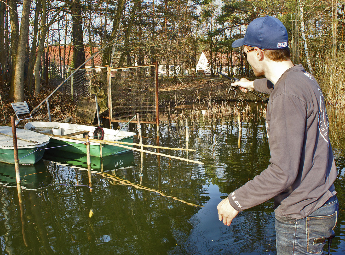 Das Fischen an Stegen ist zwar nicht ganz einfach, macht aber für mich einen besonderen Reiz aus, denn viele Fischerkollegen würden ihr Glück hier gar nicht erst versuchen. Oftmals ist das Fischen von Stegen verboten, das heisst, man muss vom Boot agieren. Hinzu kommt die Tatsache, dass die Boote am Steg mit zahlreichen Seilen oder Ketten vertäut sind. Dann kommt es darauf an, extrem zielgenau zu werfen, um Streitigkeiten mit Bootsbesitzern und Hafenmeistern zu vermeiden. Auch aus diesem Grund setze ich auf die Fransenköder, denn wie beim Fischen mit dem Texas-Rig kommt es beim Fischen mit Fransenjigs nicht auf die Wurfweite an, sondern darauf, dem Köder Leben einzuhauchen. Eine sehr langsame Präsentation veranlasst die Fische dazu, ihre Deckung zu verlassen.