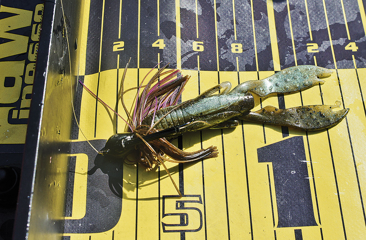 Für die langsame Köderführung sind eine Baitcaster-Rolle (kleine Multirolle) und eine Rute mit Rückgrat unverzichtbar. Dank dieser Geräte sind äusserst präzise Würfe möglich, da beim Wurf eine direktere Verbindung zur Rolle besteht. Damit kann man den Köder sogar während des Wurfs ein wenig lenken. Bei einer Stationärrolle würde der Köder hingegen eine ballistische Flugkurve, also einen Bogen beschreiben. Des Weiteren kann man mit einer Baitcaster den Köder selbst bei niedriger und gut kontrollierbarer Geschwindigkeit praktisch geräuschlos auf dem Wasser absetzen. Das ist insofern wichtig, als dass die kleinen neugierigen Egli durch lautes Platschen oftmals besonders schnell angelockt werden. Sie nehmen ihren grossen Artgenossen dann die Chance, zu beissen, weil sie sich zuerst auf den Köder stürzen. Darum ist neben der dezenten Präsentation auch ein entsprechend grosser Köder von Vorteil. Ich setze auf mindestens zehn Zentimeter lange Krebs-Nachbildungen in Verbindung mit dem Fransenjig. Dieser entfaltet unter Wasser ein besonderes Spiel und verstärkt die Abwehrhaltung, die wir mit dem Krebs imitieren wollen.