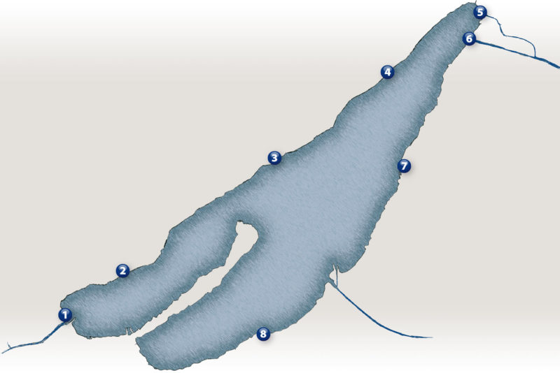 Da der Bielersee viele Häuser in Ufernähe hat, ist es gar nicht so einfach, geeignete Gebiete fürs Uferfischen zu finden. Bei Tüscherz findet man aber zahlreiche Stellen, wo man zum Wasser kommt. Ein Hotspot ist die Kursschiffanlegestelle Tüscherz. Dort kann man an die tiefste vom Ufer aus erreichbare Stelle werfen. Mit 30 g Birnenblei am Dropshot-Rig und entsprechendem Gerät erreicht man etwa 30 Meter Tiefe. Im Sommer und Herbst rauben hier die Egli regelmässig in unmittelbarer Ufernähe, da die Kante direkt beim Ufer abfällt. Im Sommer konnte ich hier schon Egli auf kleine Stickbaits und Gummifische fangen. Auch Hechte habe ich hier schon einige überlistet. Man kann eine recht grosse Strecke machen und die Kante hochfischen oder das Mittelwasser absuchen. Dank der Tiefe überlistet man auch im Winter seine Fische. Ein interessantes Gebiet, das viel Potenzial aufweist, aber selten befischt wird.