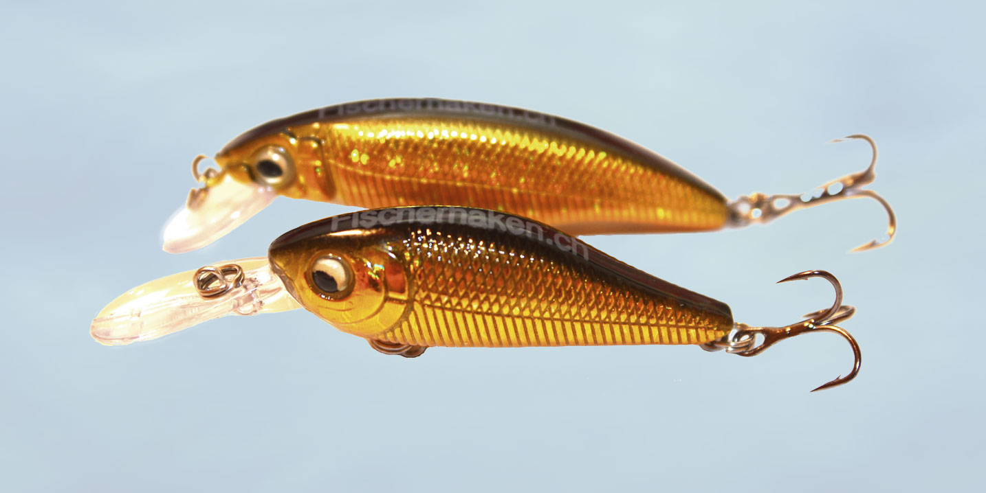 Die FH-Shad Gold kommen in zwei Ausführungen: 40 mm und 2,7 g sowie 50 mm und 3,2 g. Beide Modelle überzeugen durch überraschende Laufeigenschaften und sorgen unter Wasser für grosse Aufmerksamkeit. Damit sind sie ideal geeignet, um in kurzer Zeit viele Hotspots nach Fischen abzusuchen. Durch die Suspending-Eigenschaften lassen sich diese Wobbler an feinem Gerät präzise und genau führen und bleiben konstant in einer Tiefe von 0,5 bis 0,8 Meter.