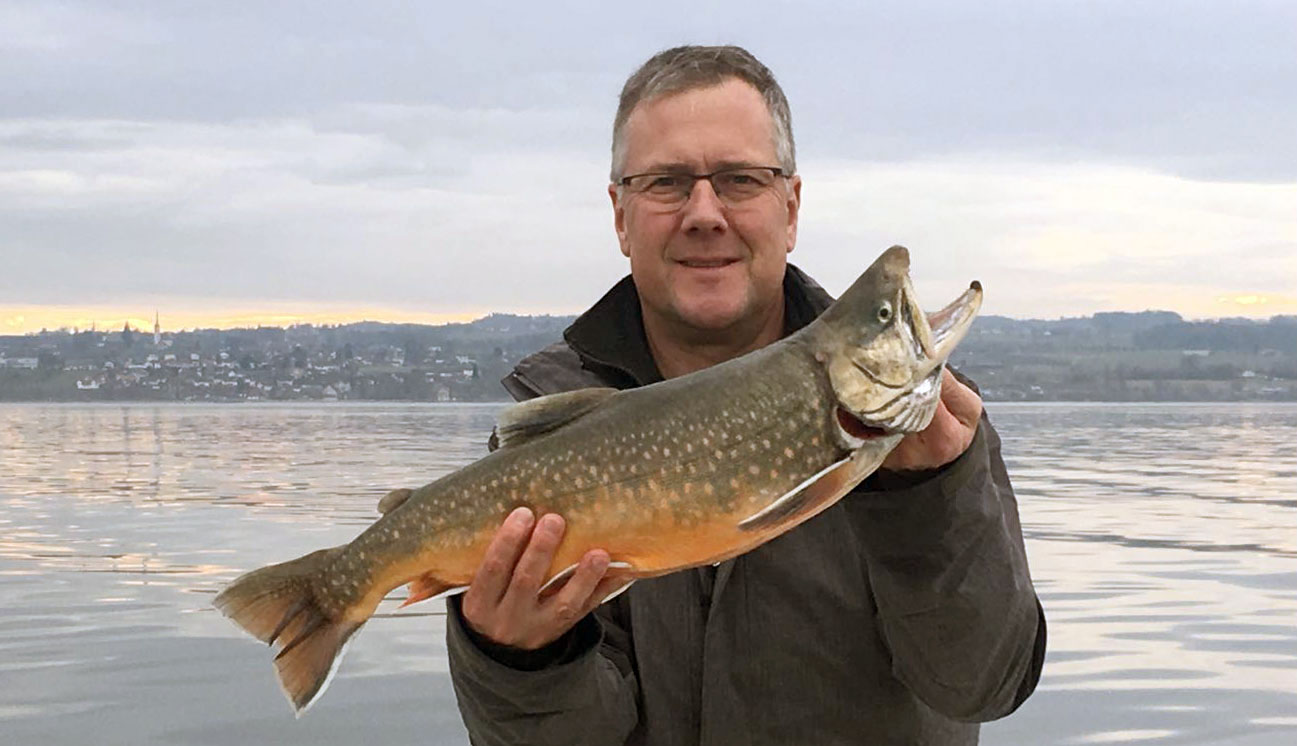 Guido Koller aus Güttingen schreibt: «Am 11. März gegen 16 Uhr, bei leicht bedecktem Wetter, biss dieser Seesaibling auf den in einer Tiefe von etwa 35 Meter angebotenen Köder. Nach vorsichtigem Einholen konnte ich diesen wunderschön gezeichneten Saibling feumern. Verwendetes Gerät: Stucki-Tiefseerolle, 0,30er-Fighter Monofil, Orvis Mirage Fluorocarbon Vorfach, silberner Locklöffel mit künstlichen Eiern.»