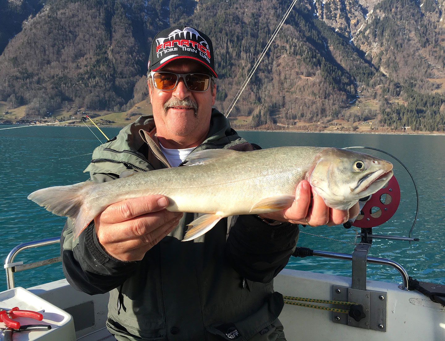 Marcel Rösch aus Steffisburg meldet: «Seit Jahren ist es am 1. Februar für Felix und mich Tradition, den Seeforellen des Brienzersees nachzustellen. Den Seehund unseres Bootes bestückten wir mit sechs Perlmutter- sowie Blech-Löffeln. Für das Fischen in der Tiefe entschieden wir uns für elf Zentimeter lange Fanatics-Wobbler. Das Wetter war nicht nach unserem Gusto: Windstill, Tiefdruck und Sonnenschein. Trotzdem konnten wir zwischen 14 und 16 Uhr zwei Beisszeiten vermelden. Leider waren es nur untermassige Fische. Aber jeder erfahrene Seeforellenfischer weiss, dass erst am Schluss abgerechnet wird! Bei uns waren es keine Seeforellen, sondern zwei stattliche Seesaiblinge in den Grössen 46 (siehe Bild) und 55 cm, die kurz vor dem Einnachten bissen und in unserem Feumer landeten! Verwendetes Gerät: Stucki-Tiefseerolle, 0,40er-Fighter Monofil, Fanatics-Wobbler.»