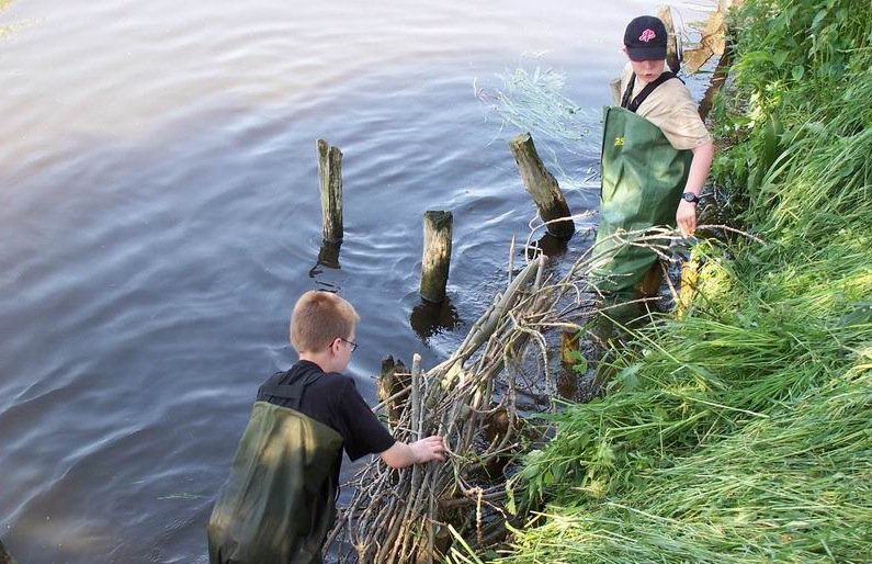 Nach der Platzierung werden die Faschinen im Ufer verankert. Dafür werden ausschlagfähige Steckhölzer mit fünf bis acht Zentimeter Durchmesser benötigt.