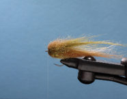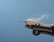 Den Kopf binden wir aus Ice Dub. Einfach mittig einbinden, zurückstreichen, mit Stützwicklungen in Form bringen und dann mit einem Velcro ausbürsten. Man bekommt auf diese Art einen voluminösen Kopf mit einem attraktiven Schimmer.