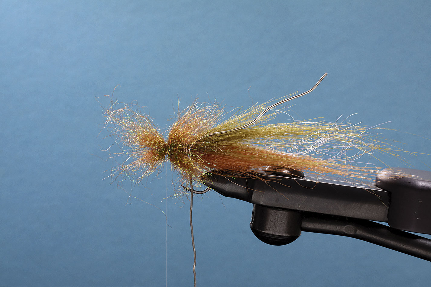 Die letzte Portion Craft Fur binden wir nach vorne ein. Dann streichen wir das Craft Fur nach hinten und umwickeln es mit Bleidraht. So hat man genügend Platz zum Einbinden des Kopfs und keine störende Haare im Weg. Der Kopf drückt das Craft Fur nach hinten und man bekommt dadurch im vorderen Bereich der Fliege etwas mehr Volumen und somit die natürliche Fischchenform. Die Länge des Craft Furs kürzen wir auf keinen Fall mit der Schere ein, sondern durch Abzupfen von Hand. Dies ergibt ein schöneres und natürlicheres Aussehen.