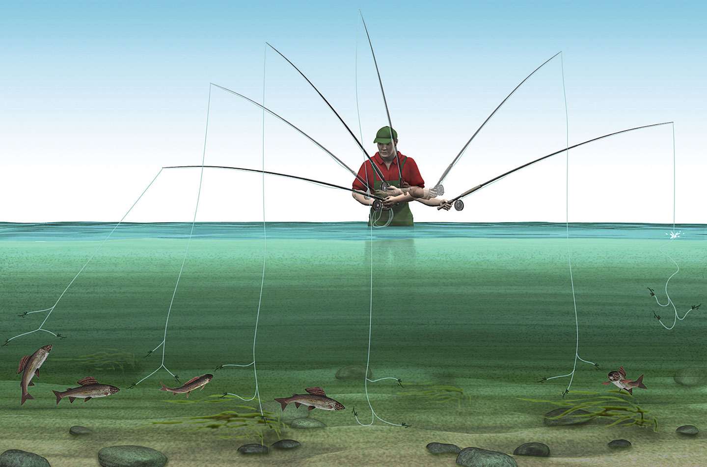 Wir heben unsere Rute steil mit ausgestrecktem Arm nach oben, so weit wir können. Nun sollte das untere Ende des Vorfachs gerade den Boden berühren. Hier knüpfen wir später die unterste Nymphe an.