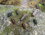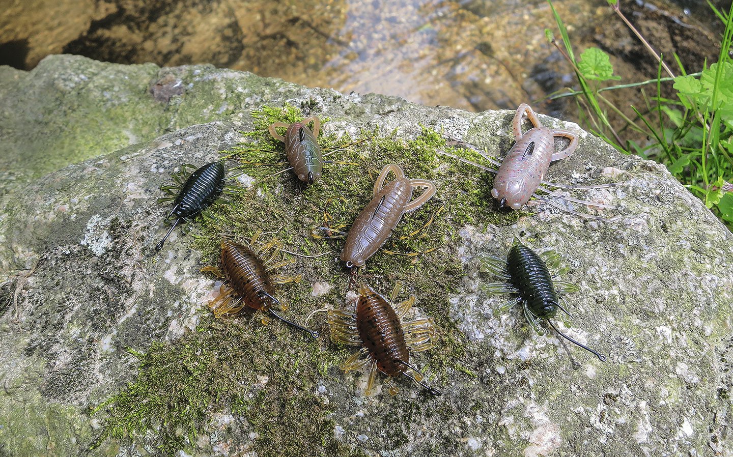 Zur Pirsch am Bach mit Insekten-Imitationen benötigt man nicht viel. Um die leichten Gummi-Imitationen ohne Zusatzgewicht werfen zu können, empfiehlt sich eine leichte Spinnrute bis sieben Gramm Wurfgewicht, kombiniert mit einer kleinen Stationärrolle und geflochtener Schnur mit drei bis fünf Kilo Tragkraft sowie ein Vorfach aus 0,22er- bis 0,28er monofiler Schnur. Als Haken setze ich auf möglichst dünne und scharfe Einzelhaken in Grösse 1/0 bis 6, um die Gummi-Attrappe nicht zu schwer werden zu lassen. Schliesslich wollen wir sie ja auf der Wasseroberfläche wie einen echten Käfer präsentieren. Je nach Ködergrösse empfiehlt es sich daher, den kleinstmöglichen Haken auszuwählen. Bekommt man ungewöhnlich viele Fehlbisse, kann man die Hakengrösse entsprechend grösser wählen. Als Köder eignen sich beispielsweise die «Woodlouse» von Illex oder der «Insecter» von Reins.