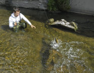 In langsam fliessenden Bereichen, wie zum Beispiel über tiefen Gumpen, kann man den Insekten mit leichten Zupfern ein wenig Leben einhauchen. Es sollte gerade so viel sein, dass die Beinchen leichte Vibrationen auf der Oberfläche erzeugen.