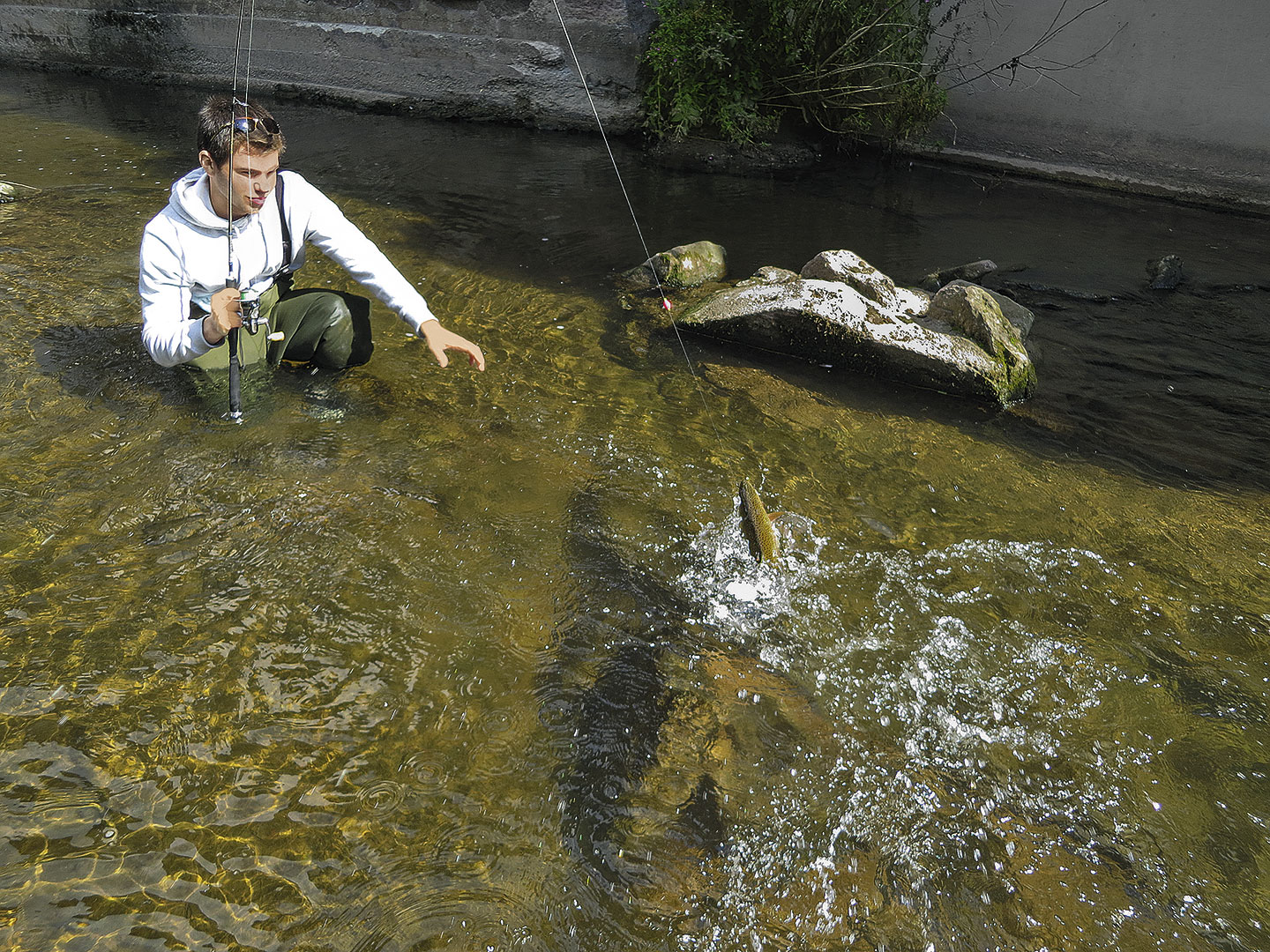 Wann immer es die Strömungsverhältnisse zulassen, bevorzuge ich es, flussaufwärts zu werfen und die Attrappe auf mich zutreiben zu lassen. Da die Fische mit dem Kopf in der Strömung stehen, hat dies den grossen Vorteil, dass uns die Räuber nicht so leicht wahrnehmen, wenn man sich von hinten an sie heranpirscht. Falls dies aufgrund der Uferbeschaffenheit oder der Strömungsverhältnisse nicht umsetzbar ist, lasse ich das Imitat mit geöffnetem Rollenbügel flussabwärts treiben. Hierbei ist es jedoch unerlässlich, den Schnurabzug des offenen Bügels mit dem Finger zu kontrollieren, sodass nicht zu viel Schnur von der Rolle gerissen wird und man beim Anhieb nicht ins Leere schlägt.