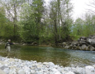Im Verlauf des Nachmittags können wir keine Bisse mehr verbuchen. Das macht uns aber nicht wirklich etwas aus; zu schön ist es hier mitten im Rauschen der Bregenzerach, um sich über fehlende Bisse zu beklagen. Die steigenden Insekten, das Flüstern der Eschen in der Böschung, meine grellgrüne Wurfschnur in der Luft; es hat beinahe etwas Meditatives, hier bis zur Hüfte im Wasser stehend zu fischen.