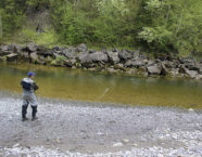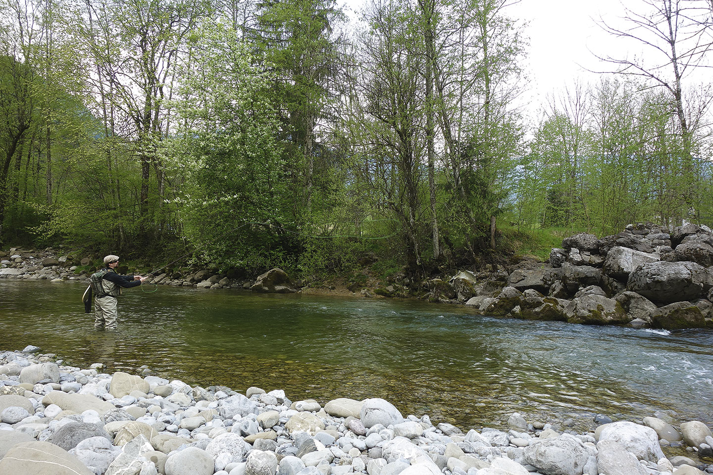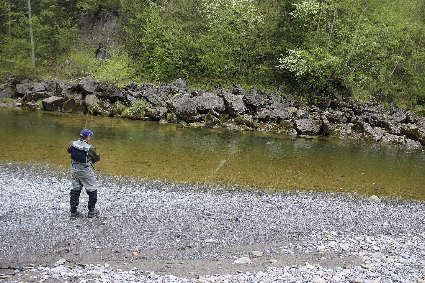 Für die ersten Würfe haben wir uns eine etwas ruhigere Strecke an der Bregenzerach ausgesucht. Schnell haben wir uns in die Wathosen gezwängt, die Gilets angezogen und unsere Ruten zusammengesteckt. Nur keine Zeit verlieren – das Wasser ruft!