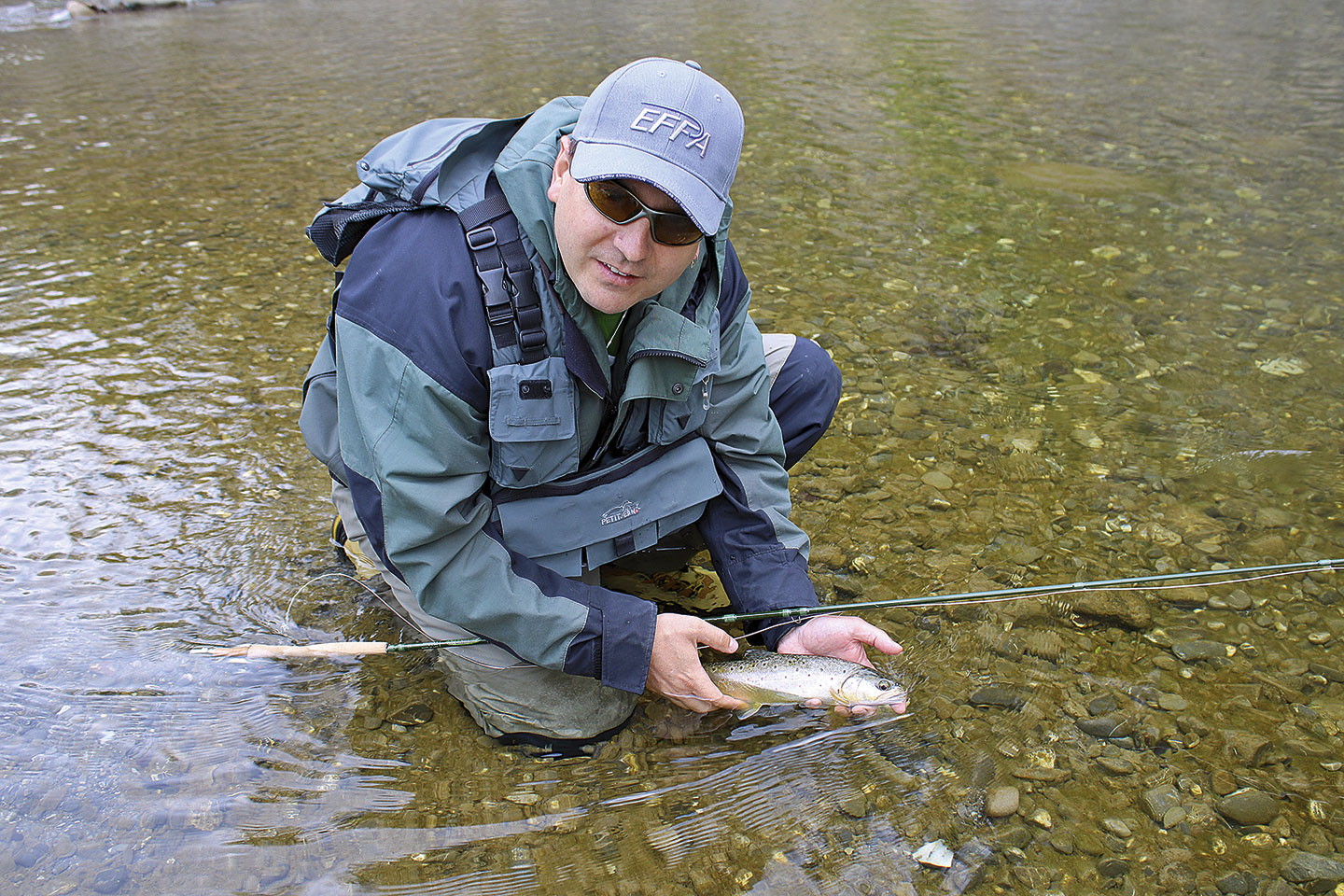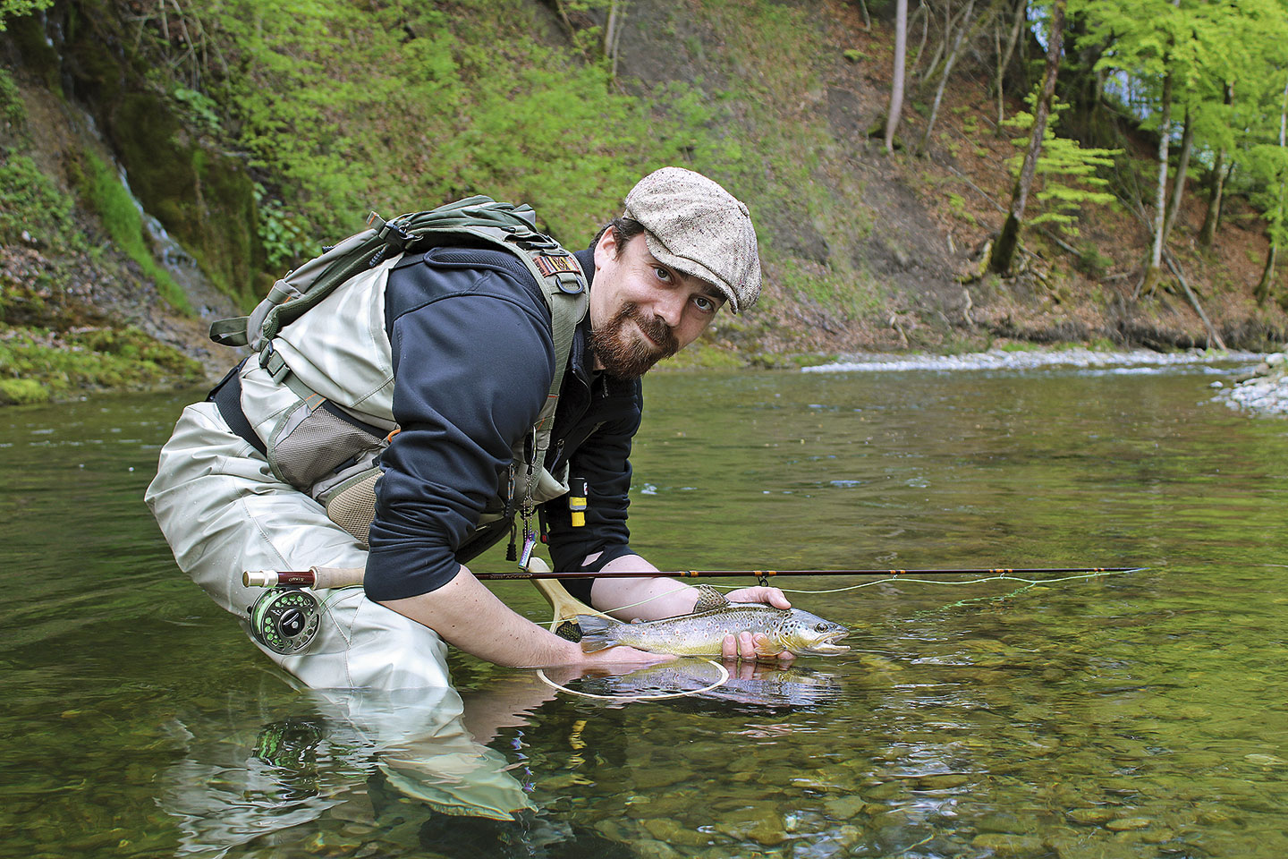 An einer schönen Stelle steigen zwei, drei Forellen schätzungsweise fünfzehn Meter vor uns. Zwar scheinen sie klein zu sein, dennoch fliegt mein federleichter Köder in diese Richtung. «Zack!» Ein Wasserschwall, meine Rute geht hoch, der Haken sitzt – Drill! Die Rute biegt sich bedrohlich, wieder schüttelt der Fisch seinen Kopf. Nach zwei Fluchten kann ich ihn feumern. Meine erste Bregenzerwald-Bachforelle ist grösser als erwartet: mehr als 37 Zentimeter misst sie!