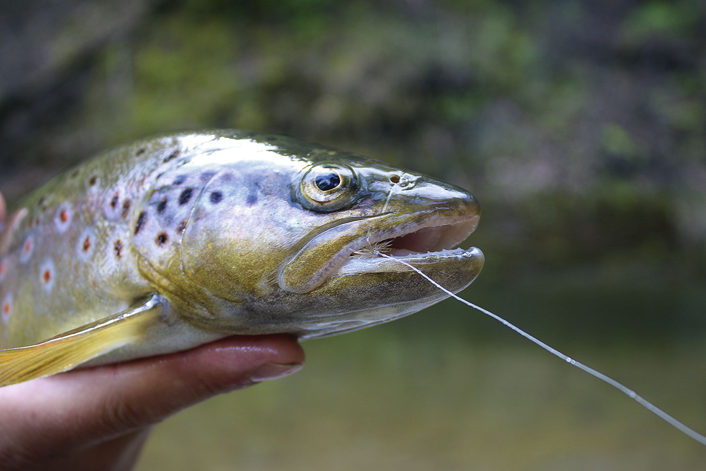 Schon bei Hansjörgs zweitem Wurf verschwindet seine Trockenfliege in einem Wasserschwall. Er hebt die Rute blitzschnell, die Forelle ist gehakt. Was für ein Moment! Es ist keine Kapitale, das sehen wir gleich. Wohl aber kämpft sie, schüttelt wild ihren Kopf, während es in Richtung Ufer geht. Oh nein, was ist das? Die Schnur ist schlaff, kein Zug mehr – die Kleine hat sich befreien können.
