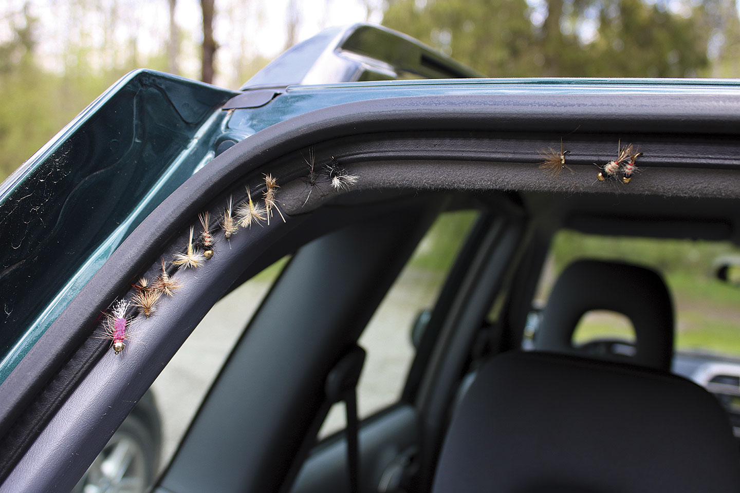 Als, wie von Claus prophezeit, die Forellen kurz vor Mittag zu steigen beginnen, montieren wir wieder um: Bissanzeiger weg, Nymphe zurück ins Döschen und die helle Trockenfliege ans Vorfach.