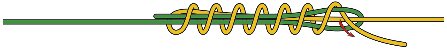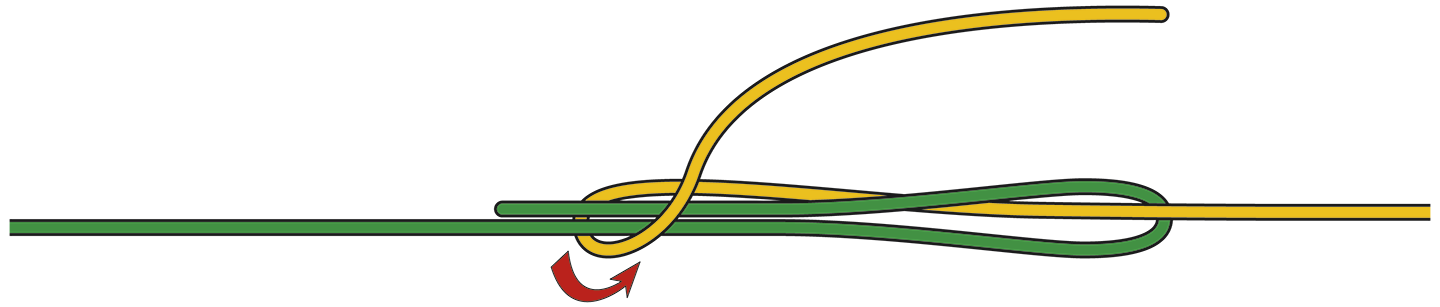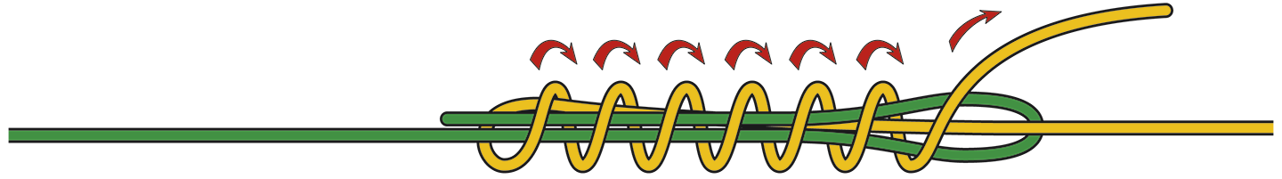 Der Albright Knoten ist perfekt, um die Fliegenschnur und das Backing (Nachschnur) fest zu verbinden. Wichtig: Das dicke Material (Fliegenschnur) wird zur Schlaufe gelegt, das dünne (Backing) wird gewickelt. Und: Beide Enden des dünnen Materials müssen auf der gleichen Seite der Schlaufe austreten.
