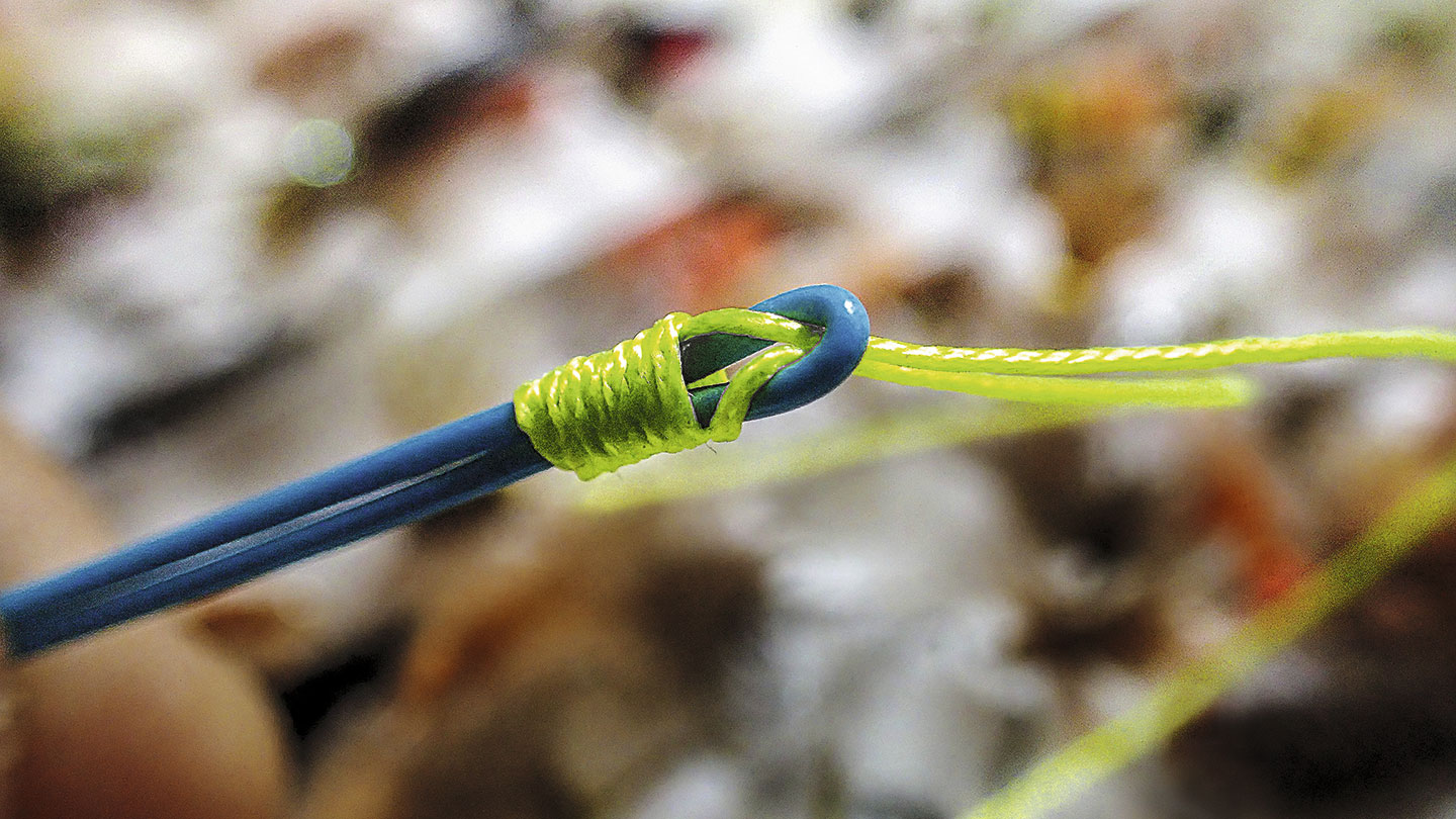 Kleiner als ein Wirbel: Der Albright Knoten, der hier das Stahlvorfach mit 0,43er-Nylon verbindet, ist nur wenige Millimeter gross. Die Enden von Nylon und Stahl wurden nach dem Foto noch gekürzt, fertig ist das Hechtvorfach.