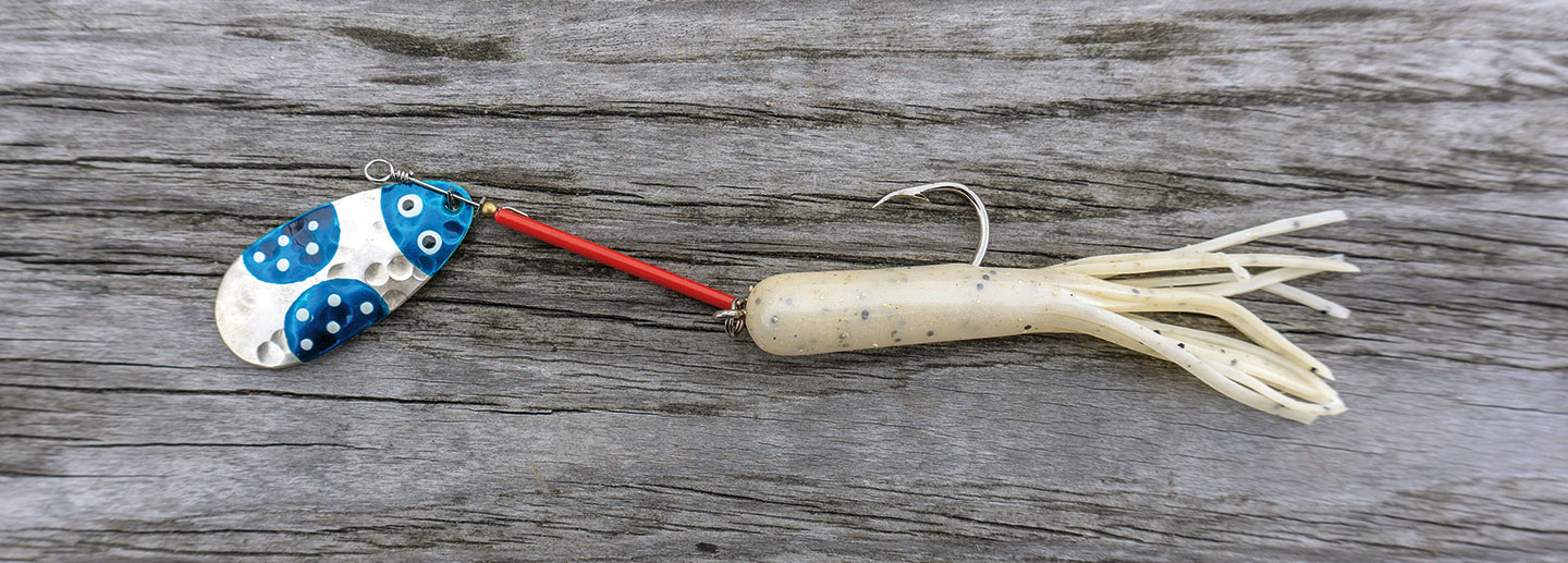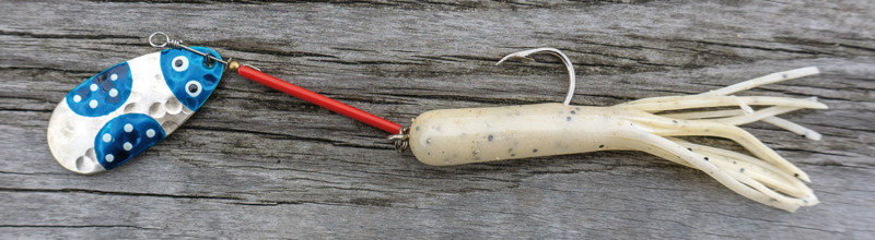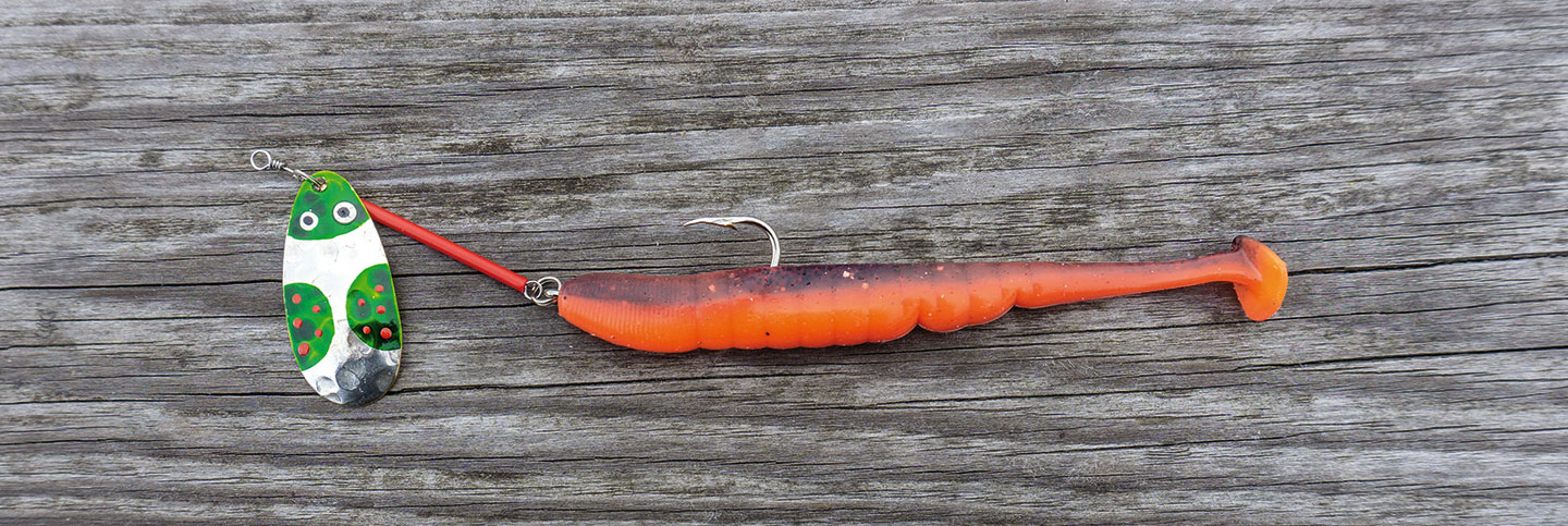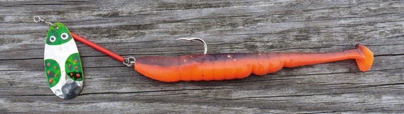Weil ich den Käferli-Löffel nur kombiniert anbiete, ersetze ich den mitgelieferten Drilling mit einem Einzelhaken, dessen Grösse sich nach der Länge des gewählten Trailers ausrichtet. Auf einen Drilling lassen sich meine Lieblingstrailer schlicht nicht anbringen und auf den Widerhaken, wo gestattet, verzichte ich auch nicht gerne, zumal ich bei dieser Technik eine eher höhere Fehlbissrate habe. Fische ich damit in unseren Breiten, d. h. vornehmlich auf Egli, verwende ich ein 15-Gramm-Blei. Nach längerem Ausprobieren hat sich das
