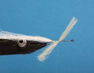 Kleinere Kinkys bis etwa 7 cm binden wir komplett aus EP Fiber. Da dieses Material relativ weich ist, neigt der Schwanz dazu, sich um den Hakenbogen zu wickeln. Um dies zu verhindern, machen wir um die Basis des Schwanzes Stützwicklungen. Den 3D-Effekt dieser Fliege erhält man, indem man die Kunstfibern in sogenannten V-Tyes einbindet. Dadurch steht die EP Fiber in die Breite ab und es entsteht ein dickerer Körper. Und dies ist das Entscheidende an diesem Streamer. Die Masse des Körpers verdrängt das Wasser und lässt den Kinky seitlich ausschären.