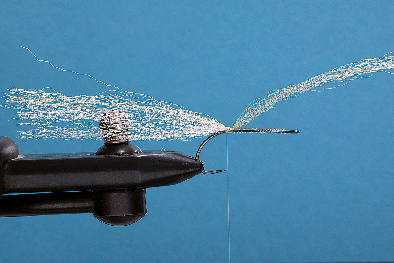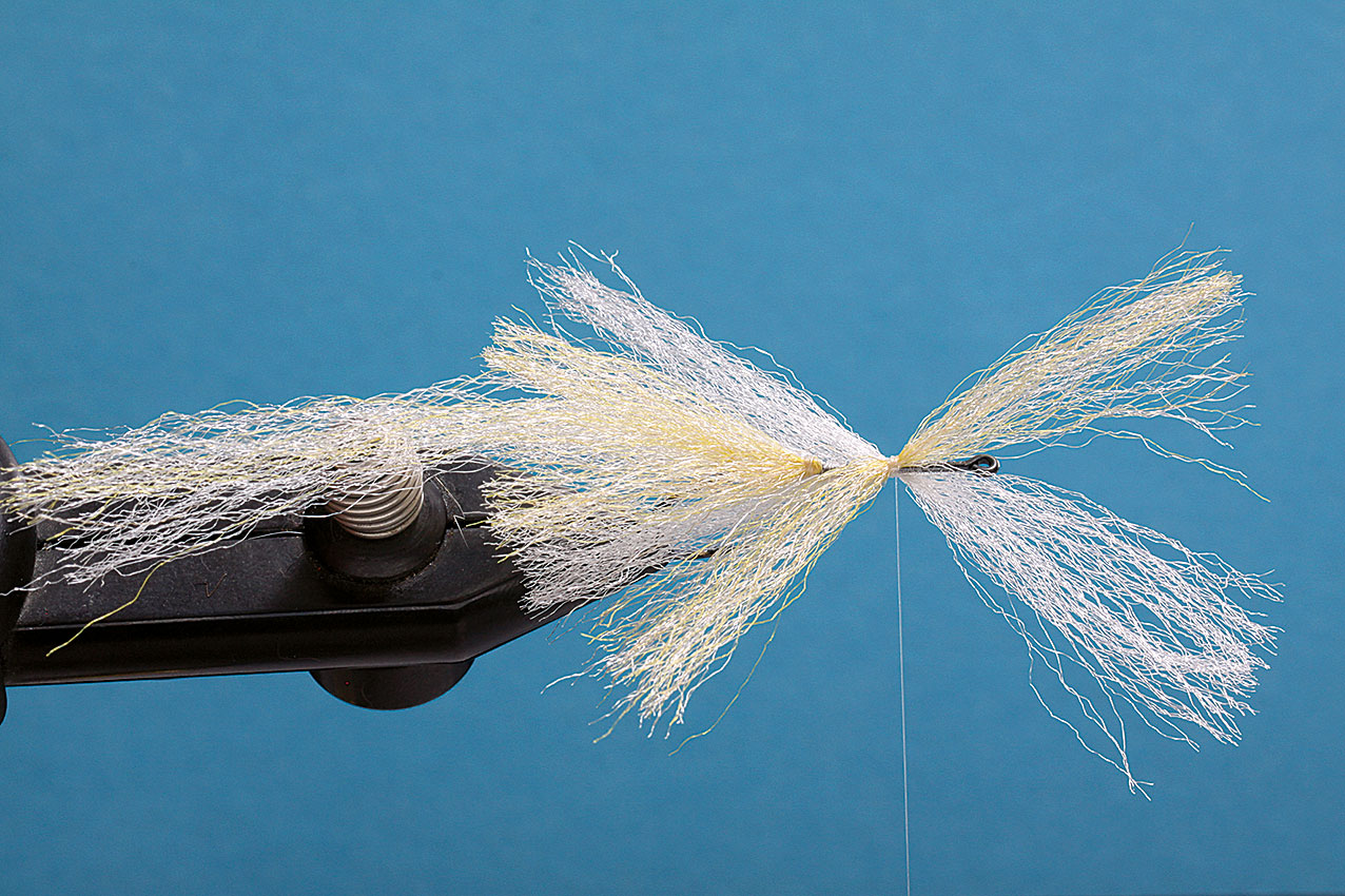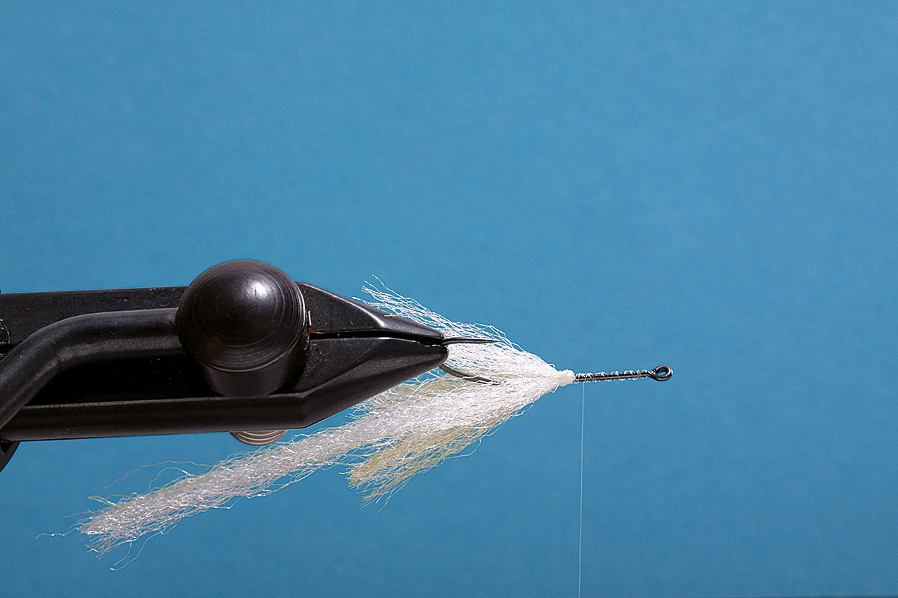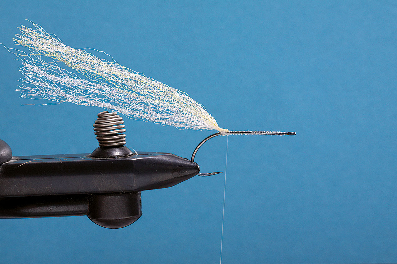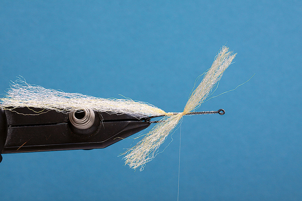 Kleinere Kinkys bis etwa 7 cm binden wir komplett aus EP Fiber. Da dieses Material relativ weich ist, neigt der Schwanz dazu, sich um den Hakenbogen zu wickeln. Um dies zu verhindern, machen wir um die Basis des Schwanzes Stützwicklungen. Den 3D-Effekt dieser Fliege erhält man, indem man die Kunstfibern in sogenannten V-Tyes einbindet. Dadurch steht die EP Fiber in die Breite ab und es entsteht ein dickerer Körper. Und dies ist das Entscheidende an diesem Streamer. Die Masse des Körpers verdrängt das Wasser und lässt den Kinky seitlich ausschären.