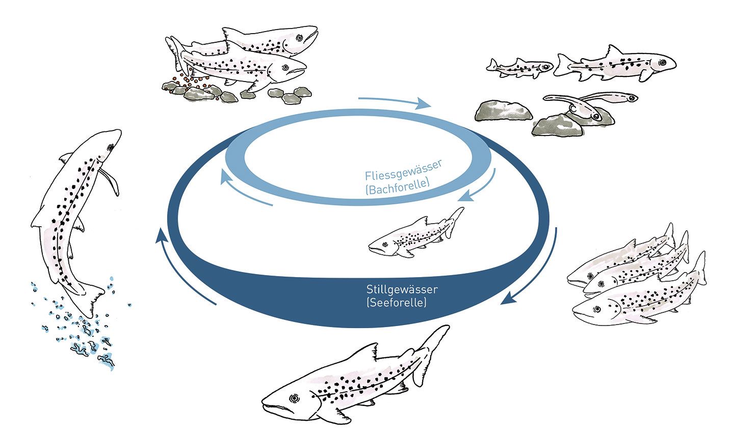 Wie profitabel der Aufenthalt in einem Lebensraum ist, hängt auch von der Fischdichte ab: Je mehr Artgenossen sich für dieselbe Strategie (Bleiben oder Wandern) entscheiden, umso stärker wird die Konkurrenz zwischen ihnen sein, wodurch die alternative Strategie attraktiver wird. Nach einer ausgeprägten Wachstumsphase steigen die Seeforellen nach mindestens einem Sommer im See in ihre Geburtsbäche auf. Flussforellen steigen von grösseren Flüssen in kleinere Gewässer auf, während sich standorttreue Forellen die anstrengende Laichwanderung sparen können. Wenn die Tage kürzer und die Temperaturen kälter werden, wird erneut gelaicht, und eine neue Generation Forellen beginnt ihren Lebenszyklus.