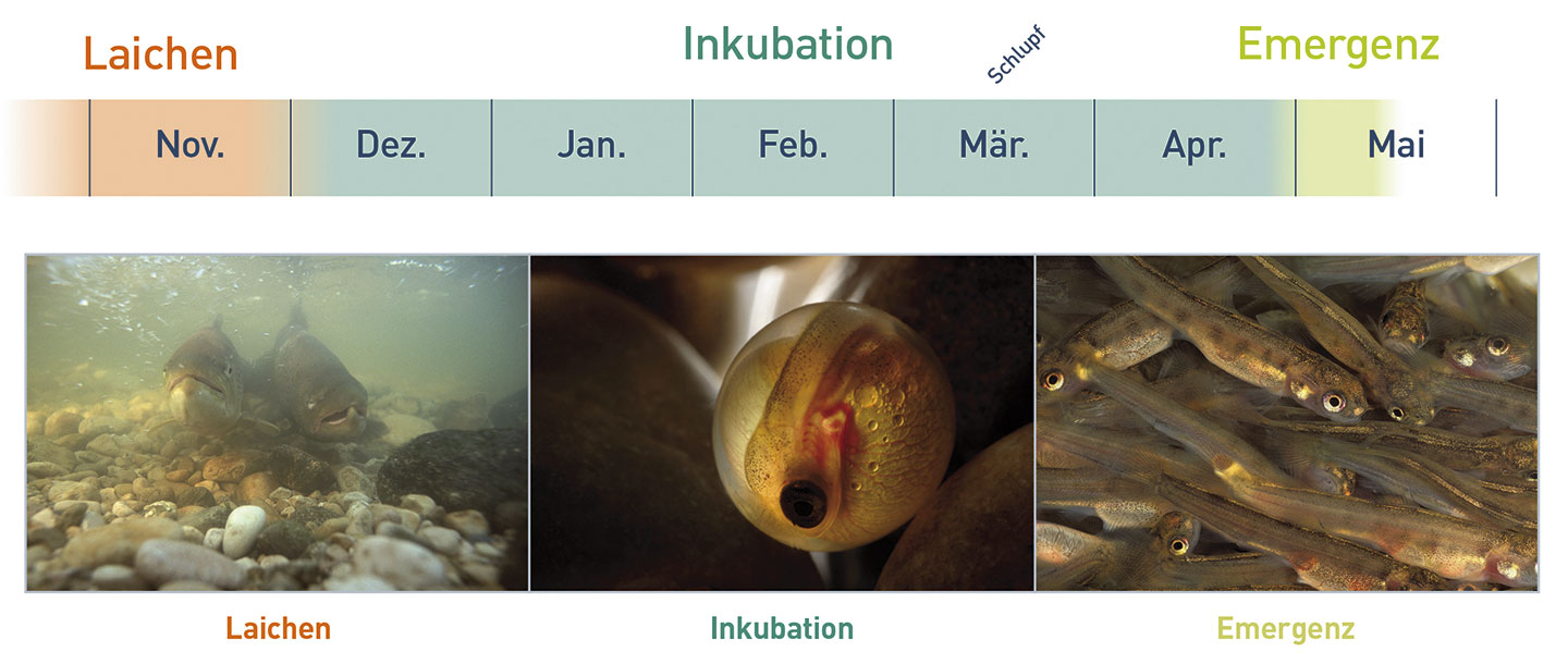 Schweizer Forellen laichen von Oktober bis Januar, in seltenen Fällen sogar im Februar, in Flüssen und Bächen. Dabei werden die Eier von den Weibchen in lockerem Kies auf dem Gewässergrund vergraben. Nach mehreren Monaten schlüpfen die Brütlinge im Frühjahr; die Entwicklungsdauer variiert dabei je nach Wassertemperatur. Das Kieslückensystem dient der frisch geschlüpften Forellenbrut in ihren ersten Lebenswochen als Kinderstube. Da sie grelles Licht meiden, dringen die Brütlinge nach dem Schlupf noch tiefer in den Kies ein. Erst kurz bevor sie ihren Dottersack aufgebraucht haben, steigen sie als sogenannte Larven aus dem Kiesbett auf (Emergenz), um mit der aktiven Nahrungsaufnahme zu beginnen.