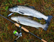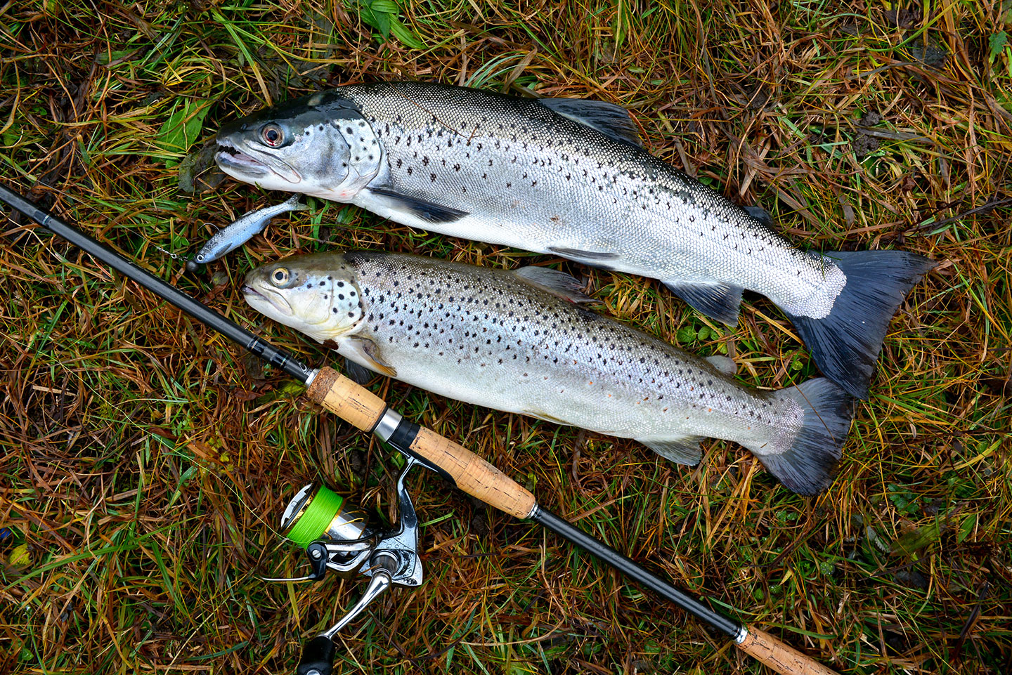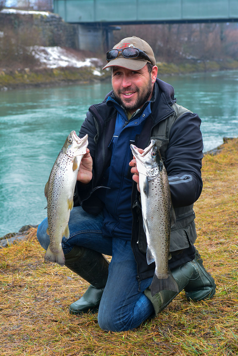 Zwei Fischer können mir letztlich nach stundenlanger Observation auf meine messerscharfe Kurzfrage einen Fang bestätigen. Einer davon ist Peter Ammann aus Dürnten. Er kennt vermutlich die Topstellen im Linthkanal, denn er liefert fast jedes Jahr an der Eröffnung seine Fische. Diesmal zaubert er eine schöne Forellen-Doublette aus seinem Rucksack – eine Bachforelle mit 47 cm und eine Seeforelle mit 59 cm. Er macht kein Geheimnis aus seinem Erfolgsköder, einem 11 cm langen Savage Real Tail-Jig. (Er meint: «Geni wirds freuen».) Man muss bei dem Gummifisch im 3D-Design wirklich zweimal hinschauen, ob es sich nicht um einen echten toten Köderfisch handelt. Die beiden Forellen haben vermutlich nur einmal hingeschaut…