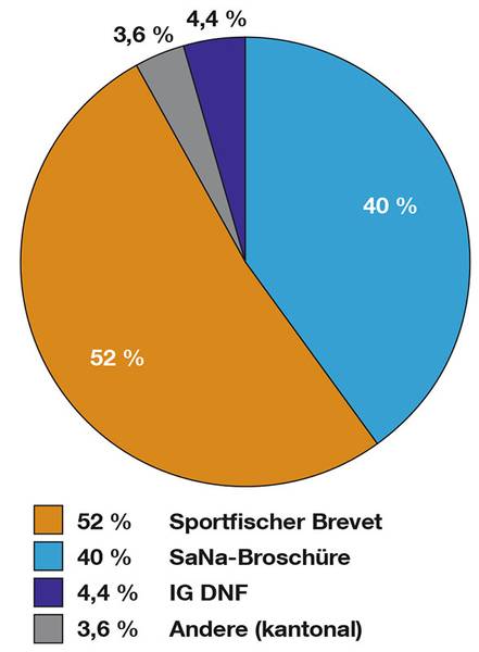 - Interessant auch der Blick auf das Lernmittel, das als Grundlage für die Kurse und die anschliessende Erfolgskontrolle verwendet wird. Erstaunlicherweise wählt die Mehrheit der Fischer für die Ausbildung freiwillig das anspruchsvollere Schweizer Sportfischer Brevet und nicht etwa die einfachere Lösung mit der SaNa-Standard-Broschüre. Fischer sind somit alles andere als Minimalisten