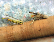 Die Beine der Heuschrecke sind so markant, dass sie der Schlüsselreiz für den Biss sind. Die Beine der Heuschrecke können Sie imitieren, indem Sie beispielsweise lange Fibern einer Feder einbinden, die Sie vorher mittig geknotet haben (Foto links).