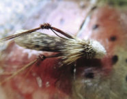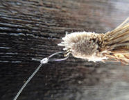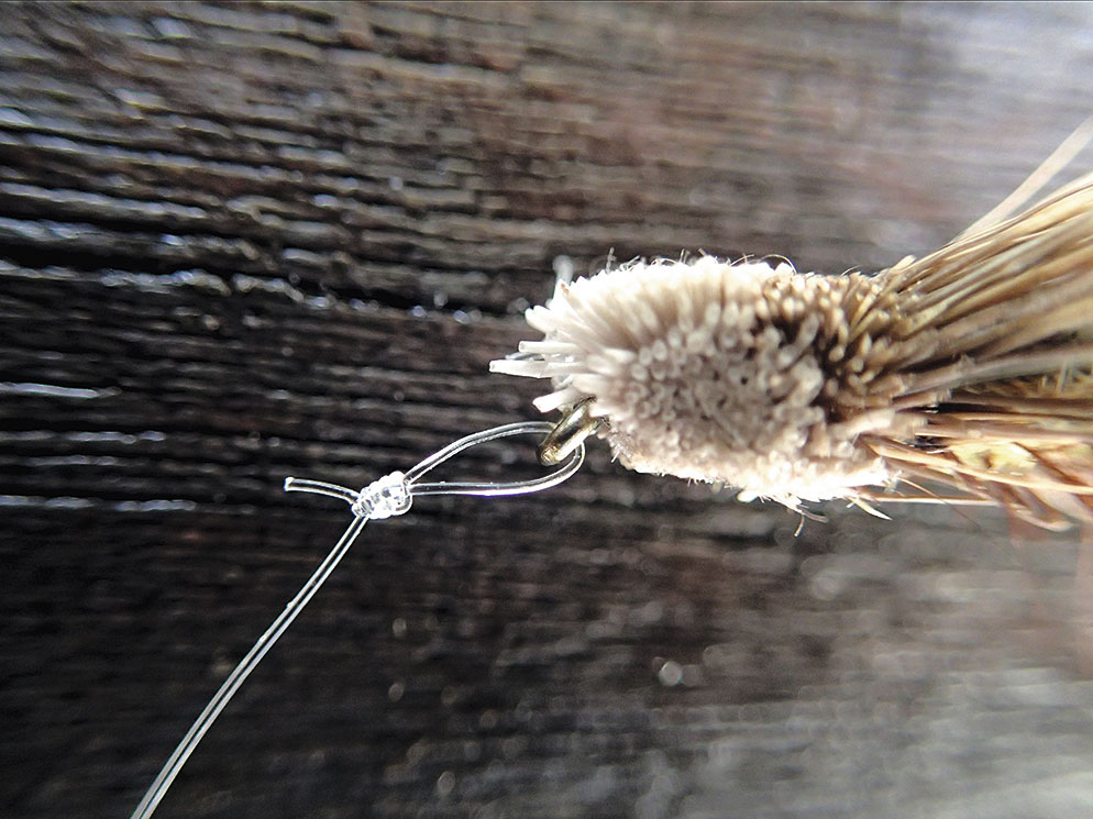 Eine andere Möglichkeit für die Nachahmung der Beine, die zum Beispiel beim «Dave‘s Hopper» zum Einsatz kommt, ist eine geknotete Feder. Dazu werden an einer Hechelfeder (im Original eine gelbe Grizzly-Hechel) die seitlich abstehenden Fibern gestutzt. Anschliessend wird ein Knoten in den Hechelstamm gemacht (Foto rechts).